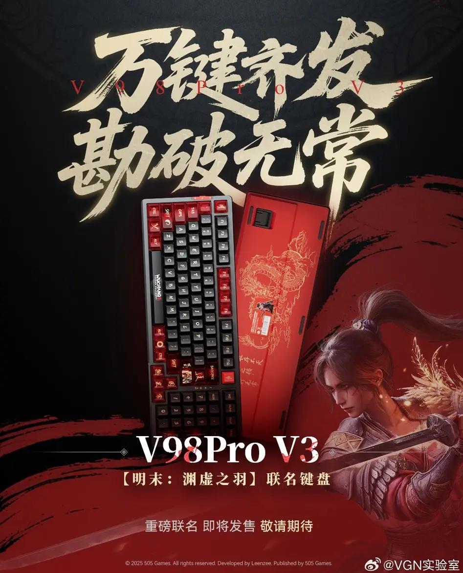 VGN实验室宣布,与《明末:渊虚之羽》官方联合推出重磅新品 V98Pro V3《明末:渊虚之羽》典藏联名键盘。官方首发价:399元