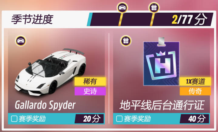 秋季赛20分进度奖励为2012款兰博基尼 GALLARDO LP 570-4 SPYDER PERFORMANTE和40分进度奖励为地平线后台通行证