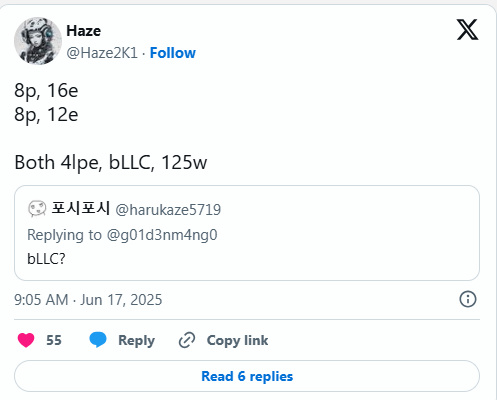 知名爆料者twi@oneraichu 透露,8P+16E将率先上市,随后推出16P+32E型号。另一名数据挖掘者twi@haze2k1 则确认了8P+16E和8P+12E的两个变体,这些都拥有4个LP内核以及125W的TDP。