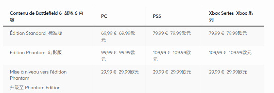 billbil-kun還爆料了《戰地6》將登陸PC、PlayStation 5與Xbox Series X|S平臺,目前無法確認是否會推出Nintendo Switch 2專屬版本。至於定價,他給出了一張圖表,其中顯示PC端標準版遊戲售價70歐元(約合人民幣589元),幻影版售價100歐元(約合人民幣842元),幻影升級包30歐元。主機端則除了幻影升級包以外,均貴出10歐元。