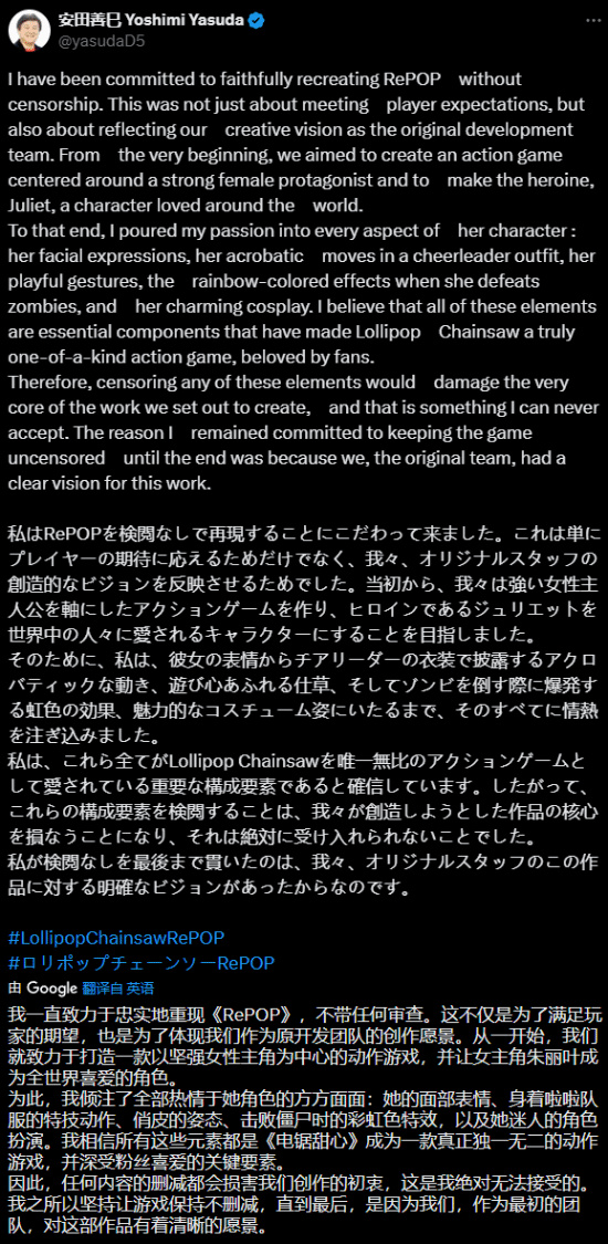 此外,本作將與前作同樣打造爲充滿黑色幽默風格的作品,因此計劃在不進行DEI(多樣性、公平性、包容性)相關審查的前提下完成產品製作。在6月份,《電鋸甜心》的遊戲設計師就曾公開反對審查制度,認爲它毀了遊戲本身。