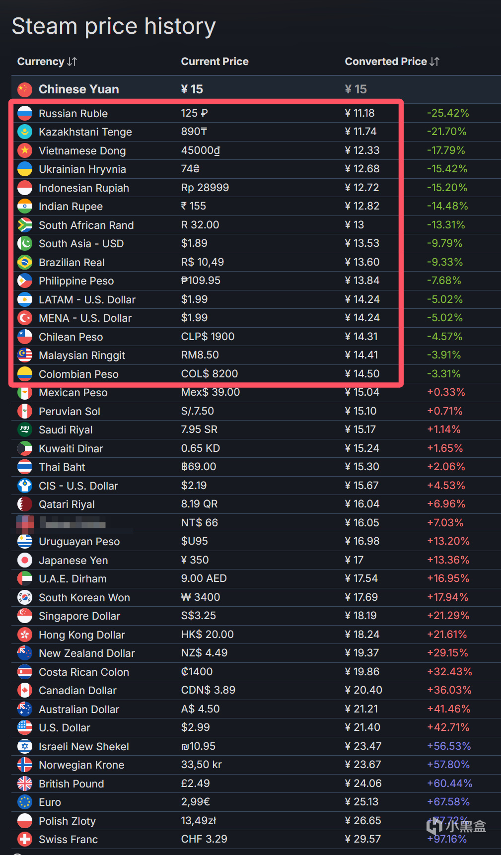 這裏借用一下另外一家網站steam db的統計,看得比較直觀,紅框圈起來的就是在steam自動定價下,比國區價格(我這裏是15元)低的地區: