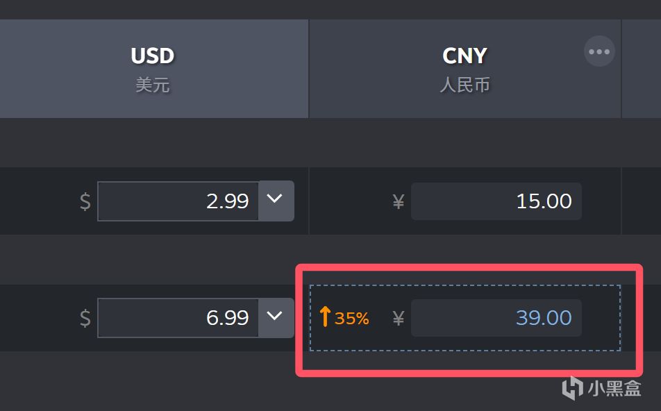 回到Steam的定價後臺,當我們設定好一個價格後,再去調整steam推薦的價格,比如我這裏把我另一個遊戲《天際都市物語》的國區價格調整爲39元,他就會顯示比steam當前推薦的價格高了35%.