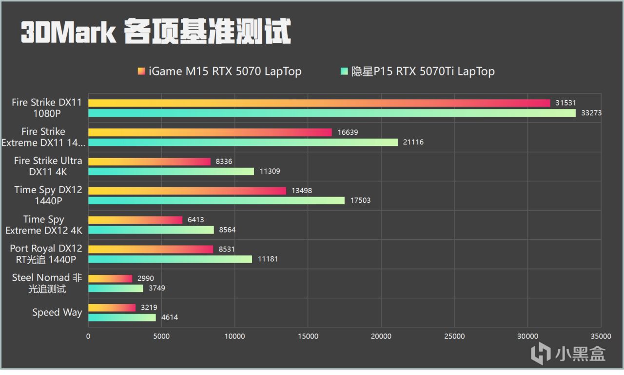 理论性能还得看三弟马克,来看看这块RTX 5070移动端的表现如何。数据方面请出上期嘉宾隐星P16Pro,正好看看70与70Ti差距有多大。