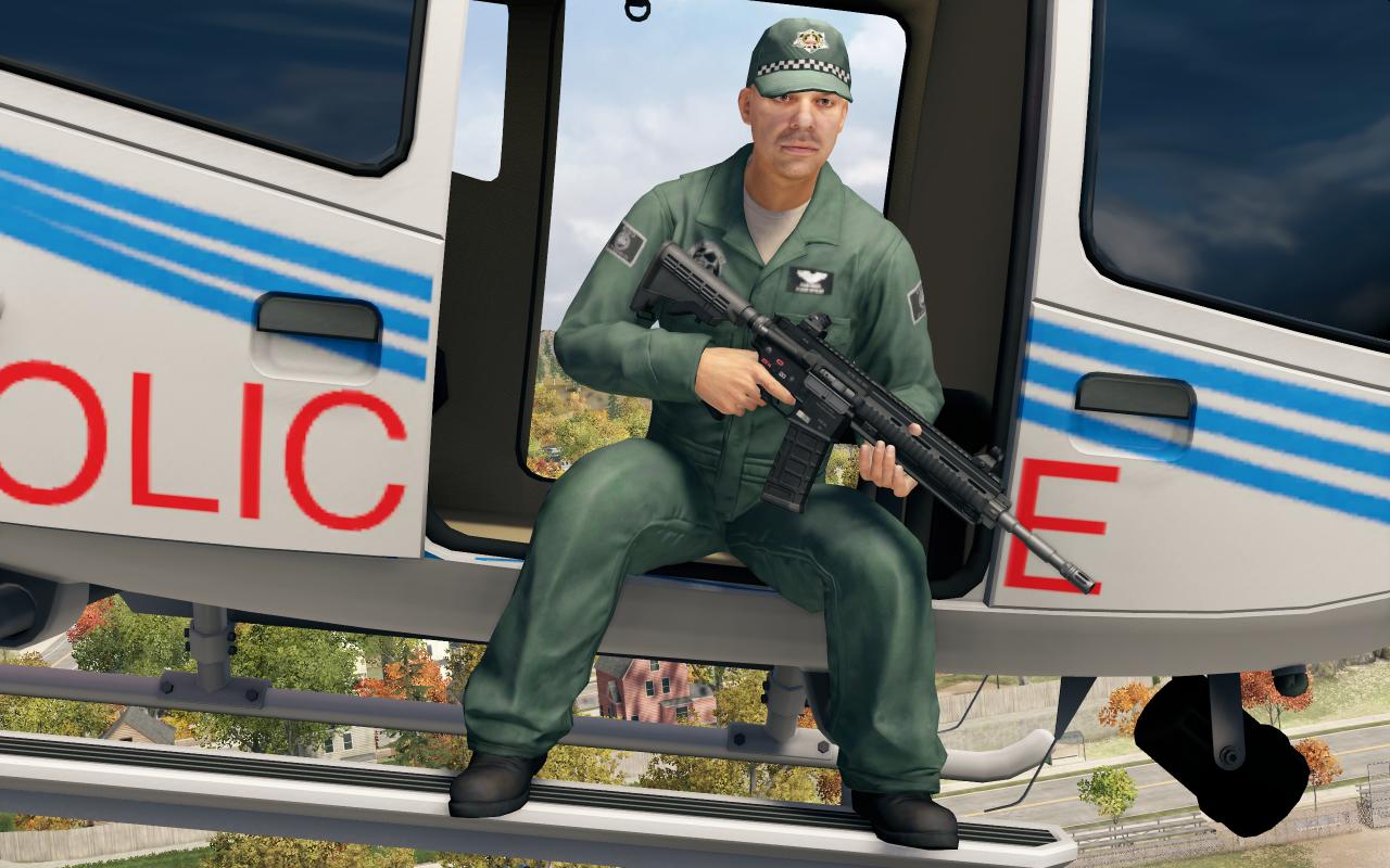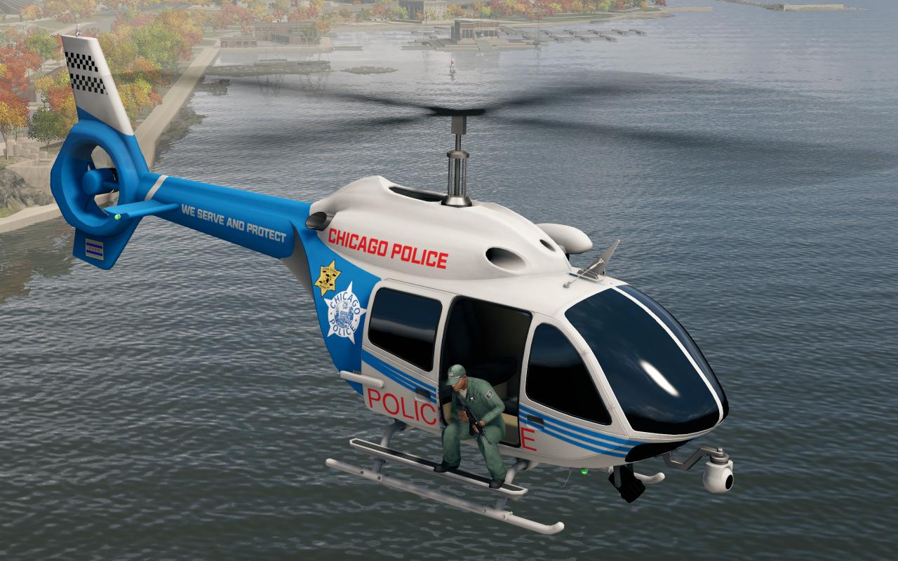 警用直升機會在這一等級被派遣,經過模組改動,現在警用直升機的警員將不再是特警,而是獨屬於芝加哥空警特遣隊的機組人員,他們沒有佩戴任何防護,穿着黑色或深綠色的機組制服,同時手裏不會配備武裝,哪怕你主動攻擊他們,他們也不會還擊,而只是進行觀察。直升機的貼圖也發生了變化,現在機身除了芝加哥警察局的徽標外,還多了一個庫克縣的徽標。