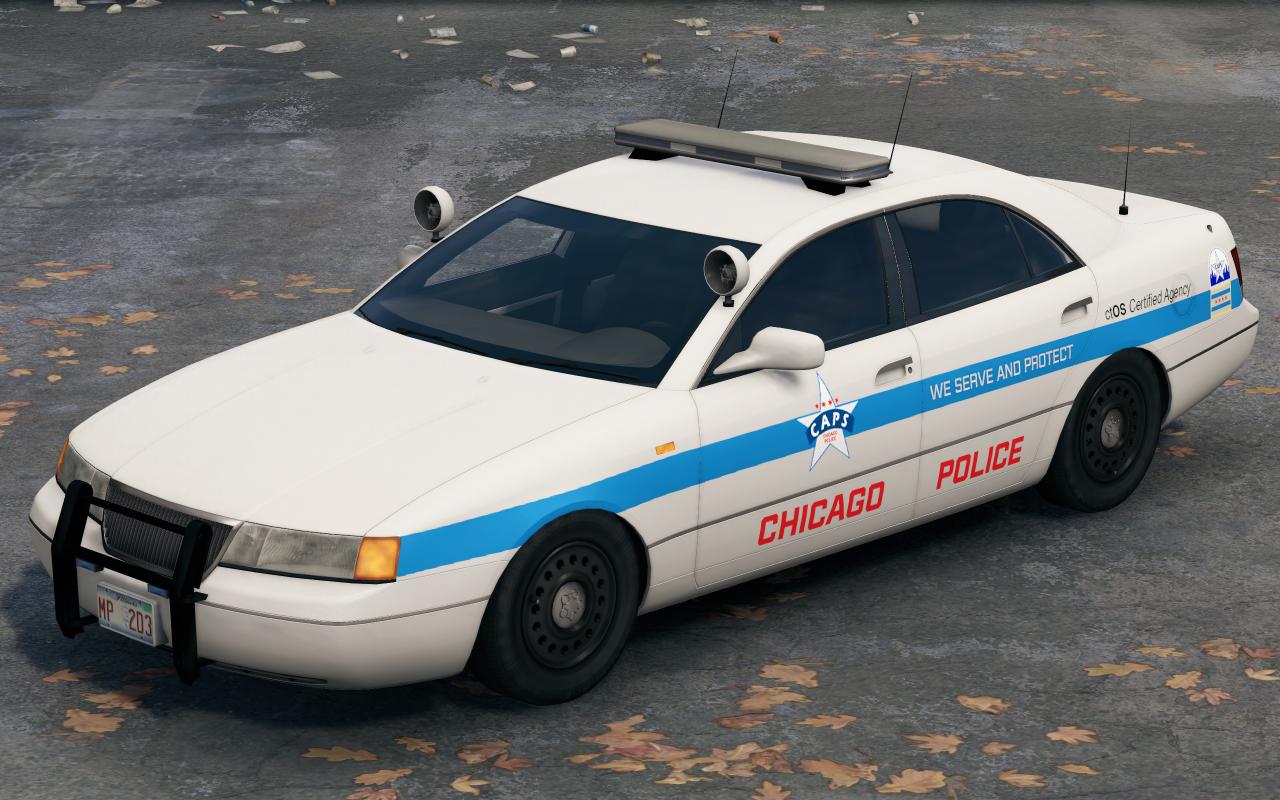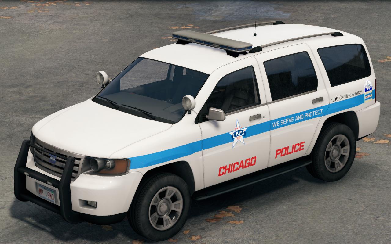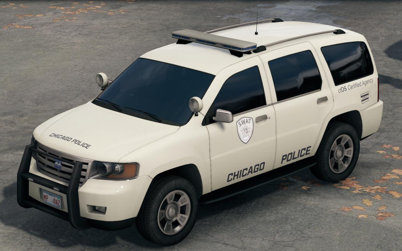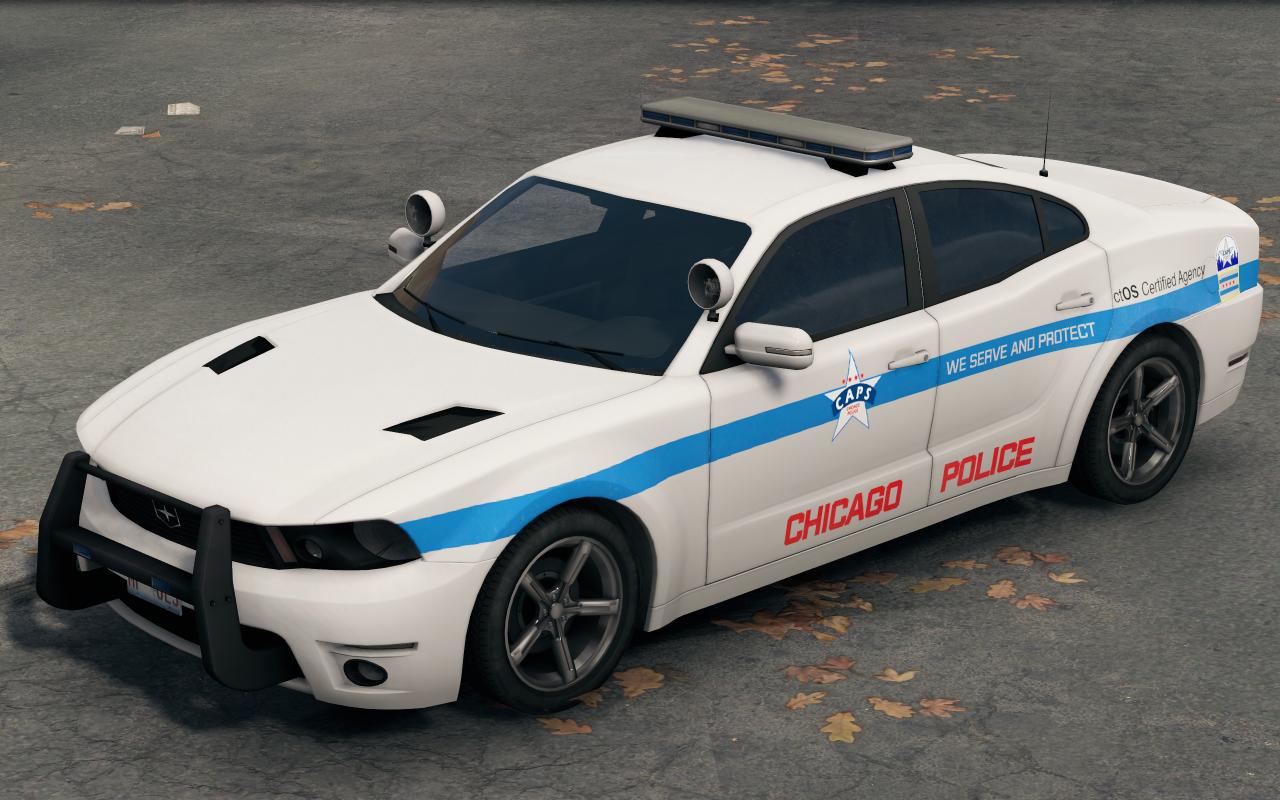這些巡邏車保留了原版的白底藍條,同時對警車車身的圖案增加了芝加哥的“五星四行”市旗和CAPS徽標,使其更像現實塗裝(CAPS爲Chicago Alternative Policing Strategy的縮寫,意爲芝加哥社區警務模式),同時增加了警局的官方標語“我們服務並保護您”,在汽車尾部爲了貼合世界觀額外增加了一個“ctOS認證機構”的貼紙。