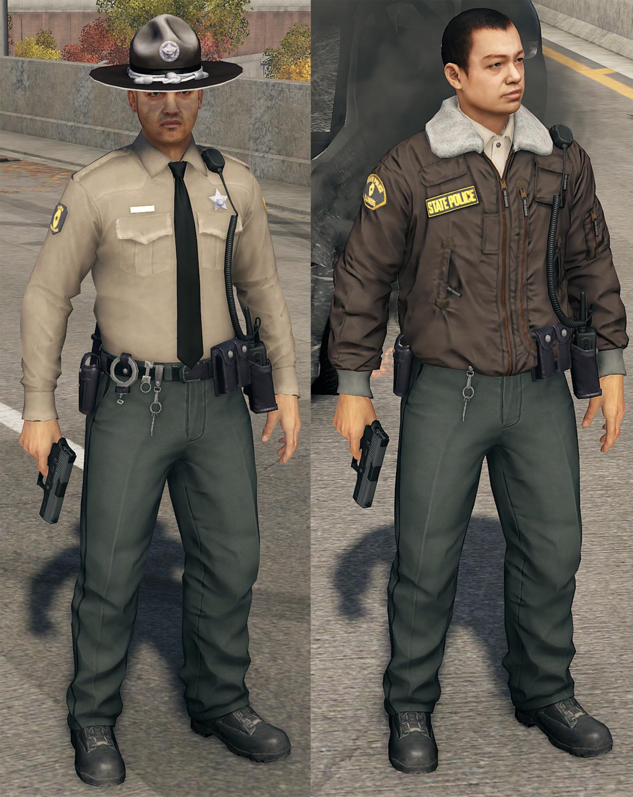 你能很容易的在一片黑壓壓的警員中發現州警的身影。他們的服裝爲經典的棕色襯衣配羊毛翻領制服夾克,有的還會戴一頂硬檐羊毛氈帽。