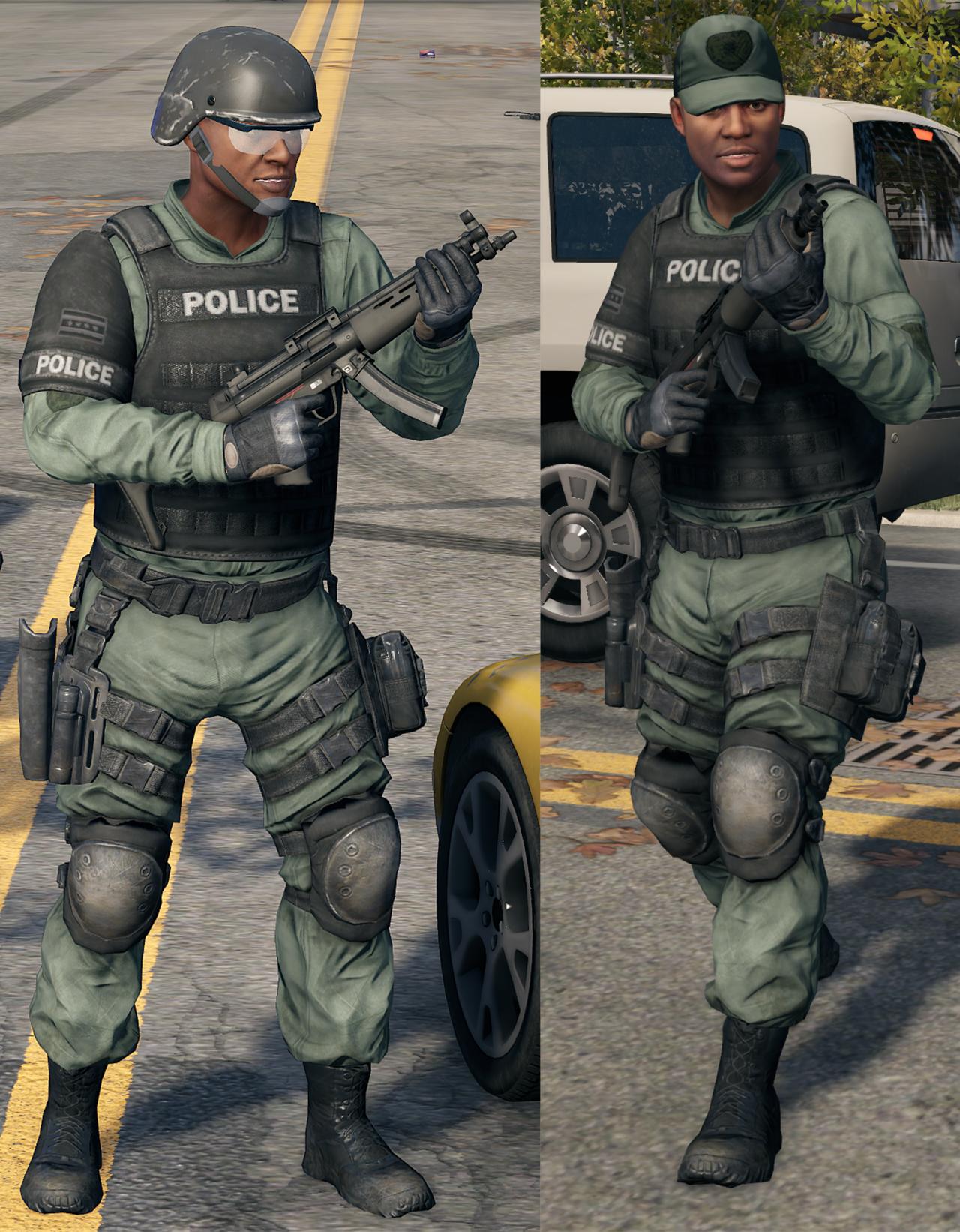 特警隊有兩種隊員構成。第一種是“精英”隊員,普通特警,這些人穿着深綠色的戰鬥服,並配備了防護效果更好的防彈衣,頭部佩戴防彈頭盔和防破片護鏡(有的會只帶鴨舌帽,但一樣有保護效果,子彈打上去還會冒出火星,估計是模型替換),四肢佩戴了護膝護肘,同時在腿帶上還有一個額外的手槍套用於放置自衛武器,這些特警將更傾向於繞側攻擊,使用武器爲416突擊步槍、MP5衝鋒槍和M1014霰彈槍。