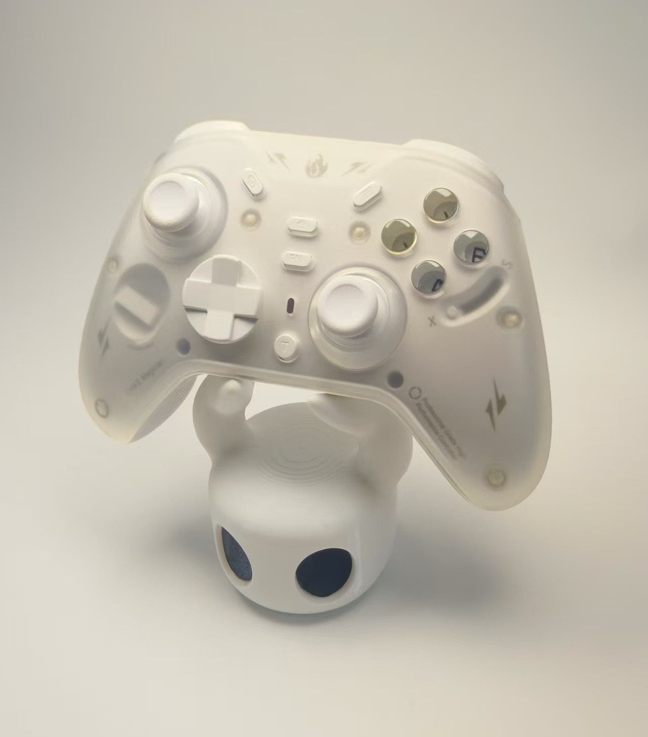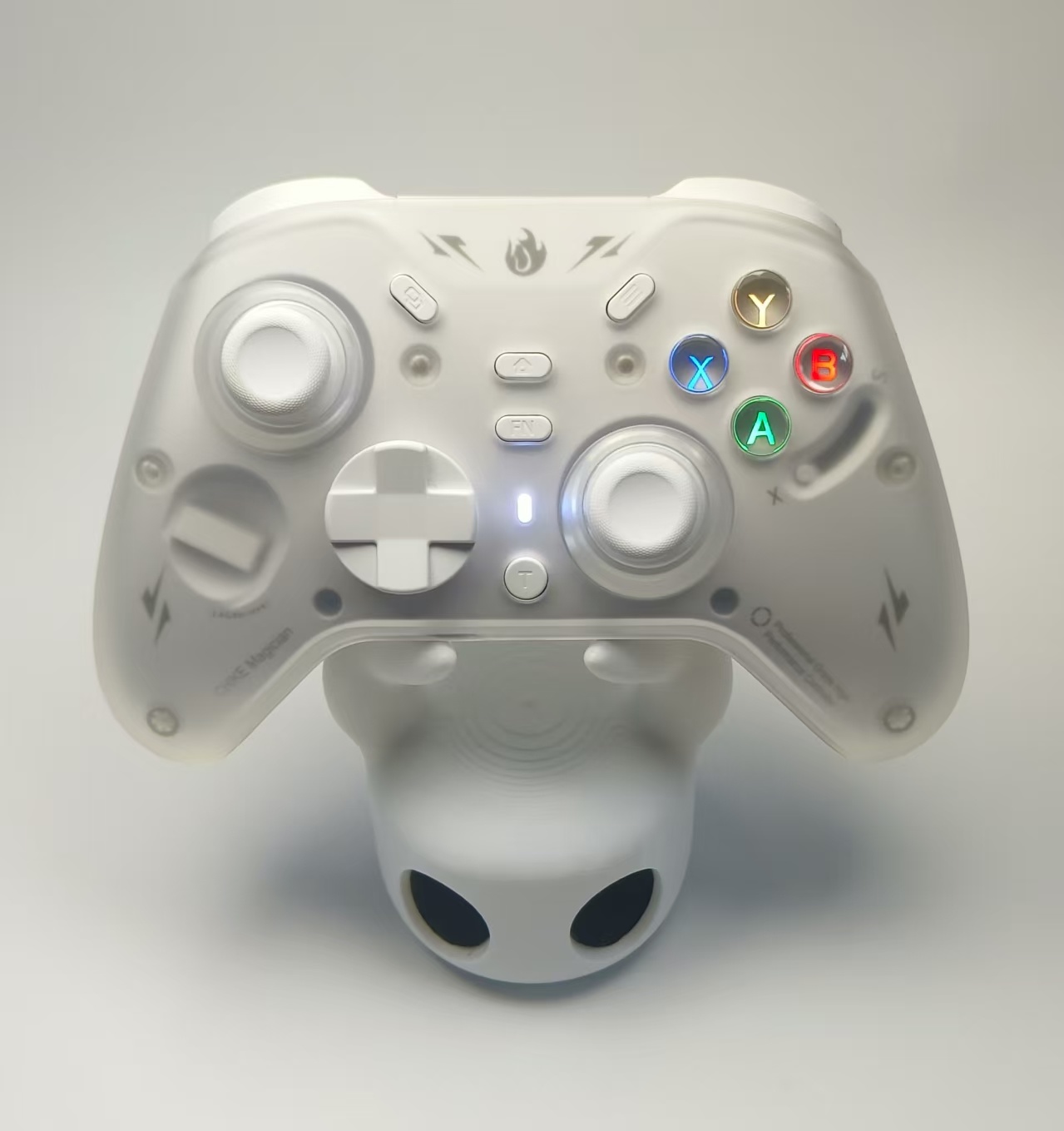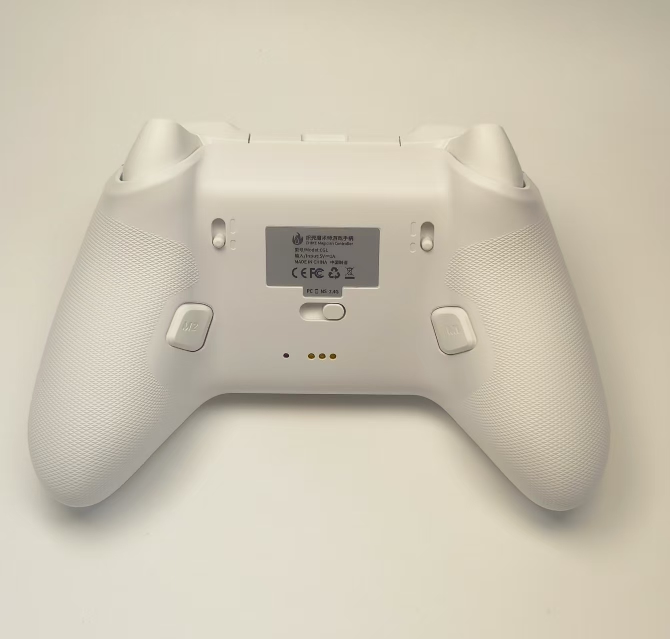 首先是外观方面,这款手柄的外观以白色配色为主,整体非常简约大气,前面的面壳采用了透明磁吸面壳,感兴趣的小伙伴还可以自行客制化。其中2.4G无线接收器就藏在了面壳之下,这也很好的避免了使用后因收纳不当而造成丢失。