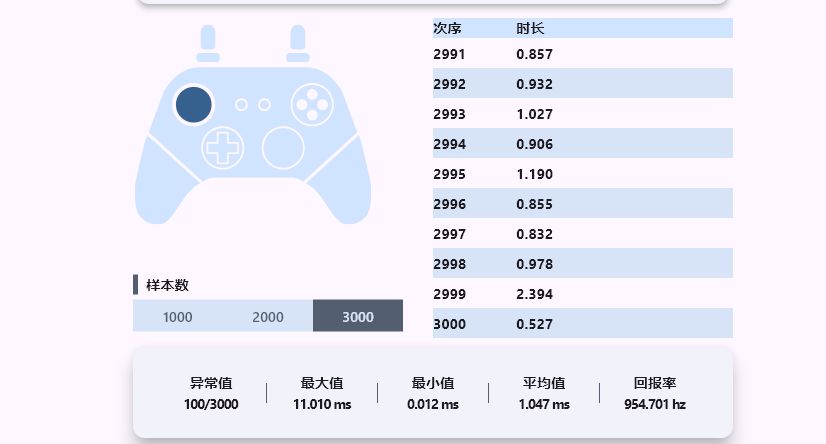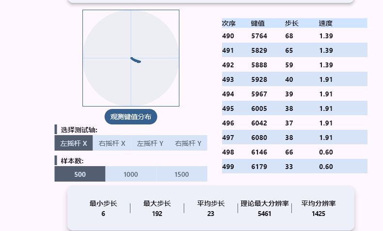 手柄的摇杆采用了霍尔摇杆,并且经过了专业调教,相较于市面上其它的摇杆,这款摇杆大幅度降低了回中偏差,从而避免了摇杆的漂移。在实际测试中,这款摇杆的有线无线回报率都能来到1kHz左右,分辨率高达1400左右,画圆错误率也仅仅只有0.4%。
