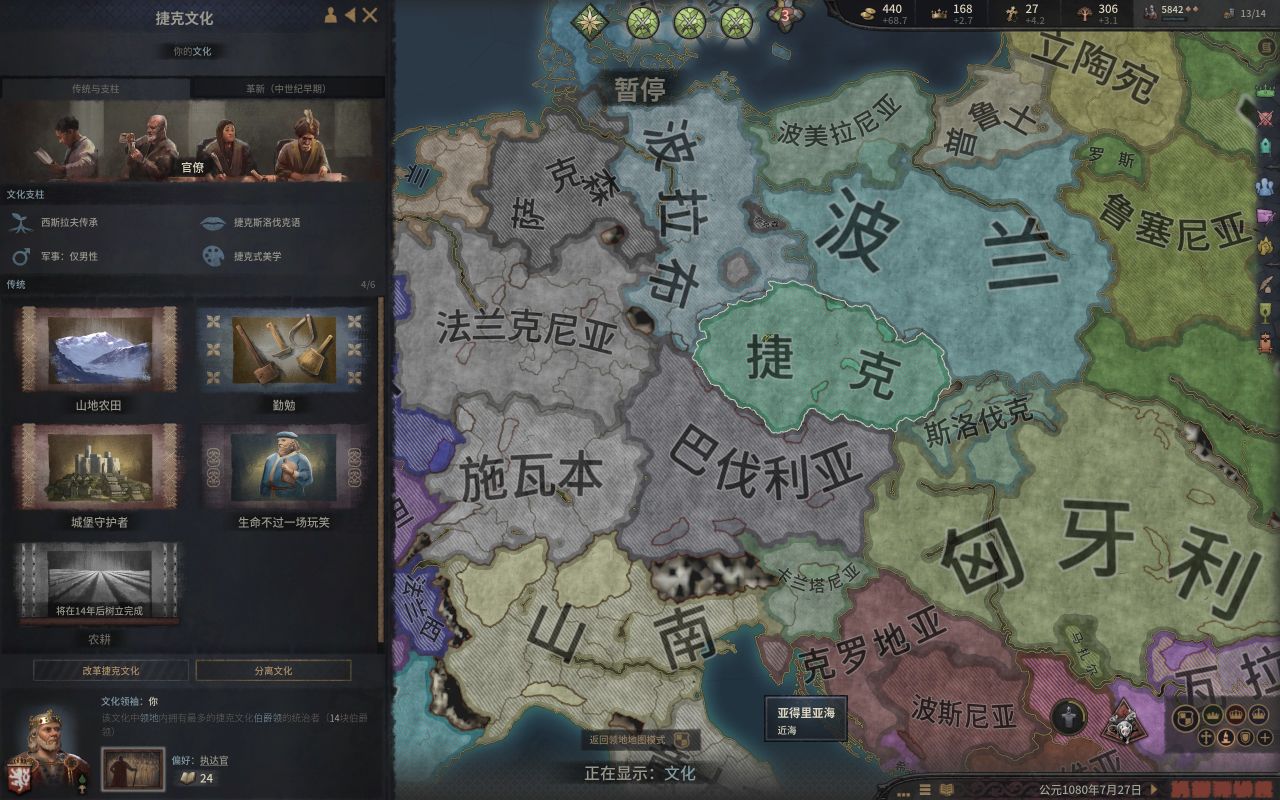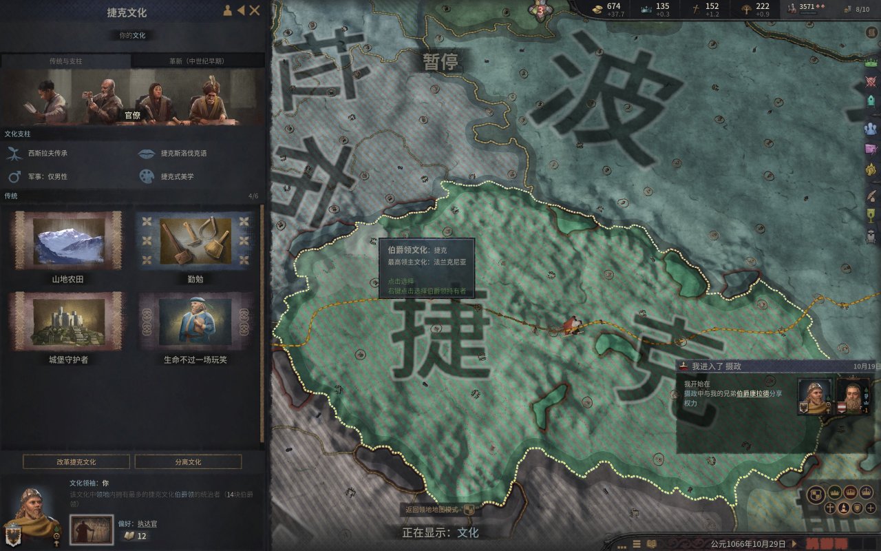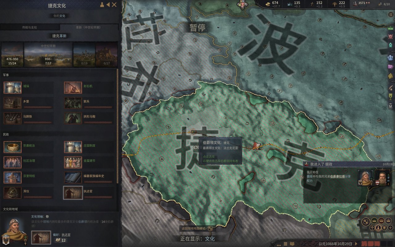 由圖所見,捷克文化在1066的科技發展屬於中上水平,而特性方面看上去比較一般,但是因爲莊園建築+勤勉,水車+風車這兩個bug級別的建築可以開始營建了。