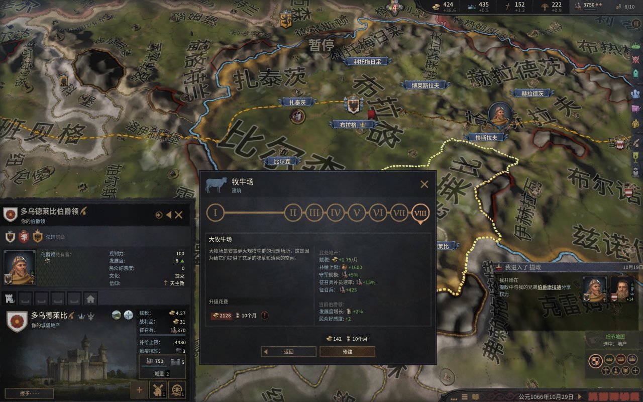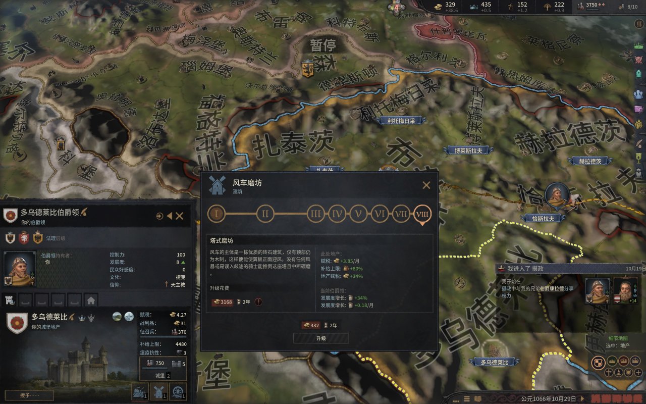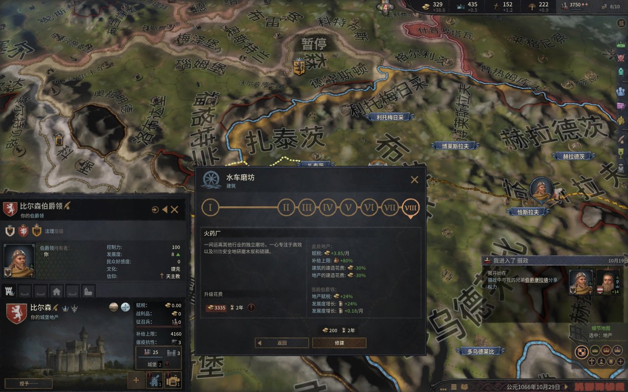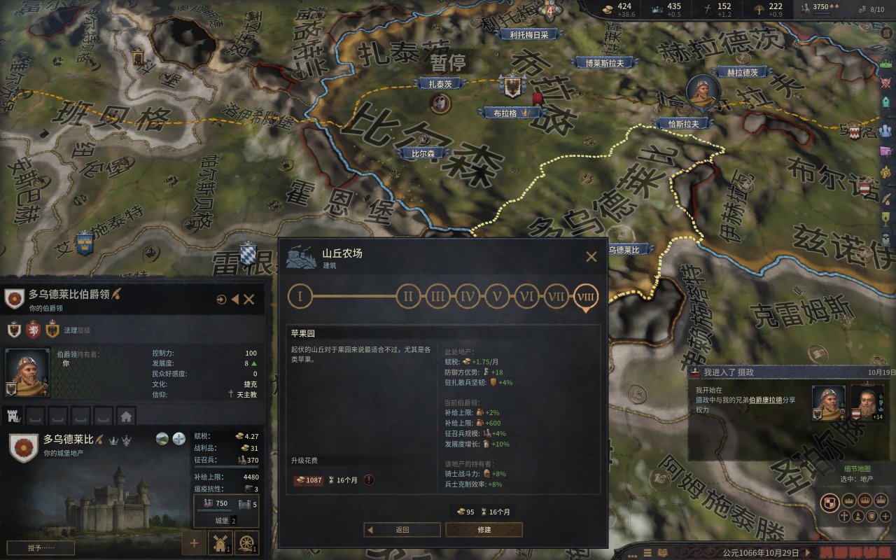 而在這個時候,我們的波西米亞公爵領的營建正在熱火朝天,幾乎每三個小時就能升級一個建築。而且可以利用改變伯爵領首府,來給其他的男爵領去建造水車和風車(這裏的bug是可以在建造好二級風車和水車後,再次轉爲男爵領,而這些建築仍然有效,而且可以卡出新的建築槽)。