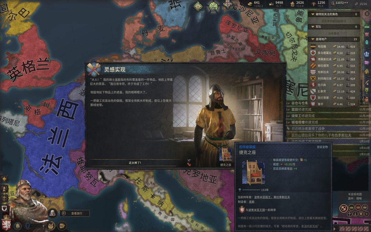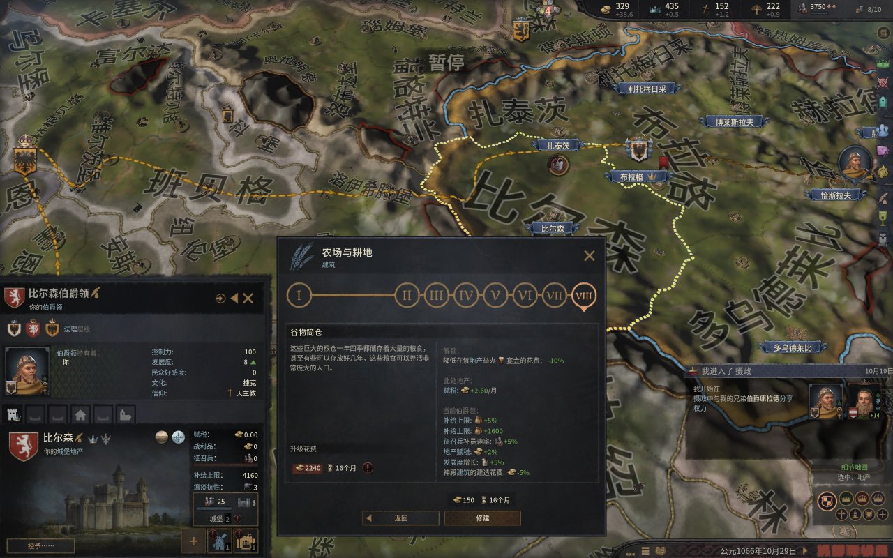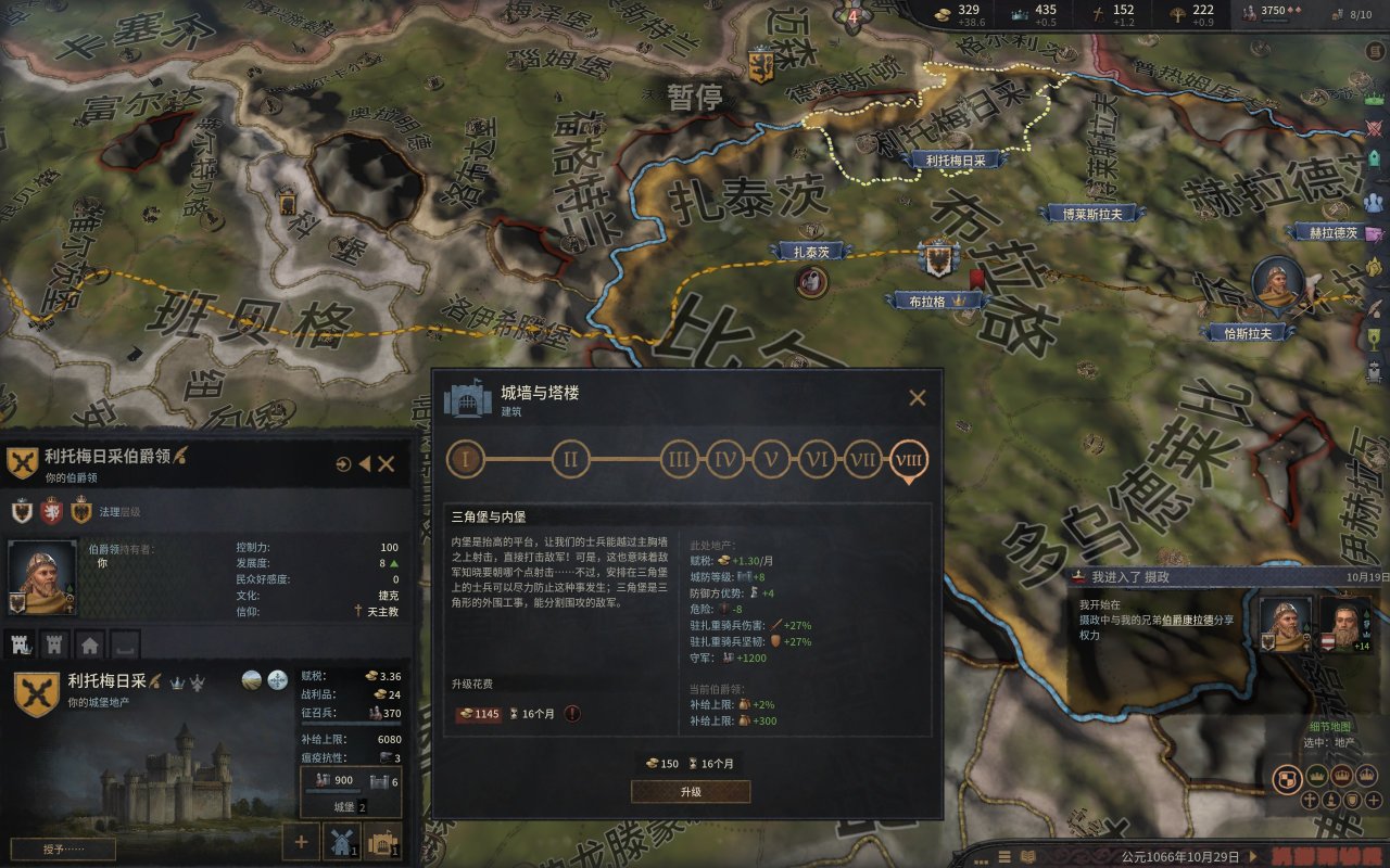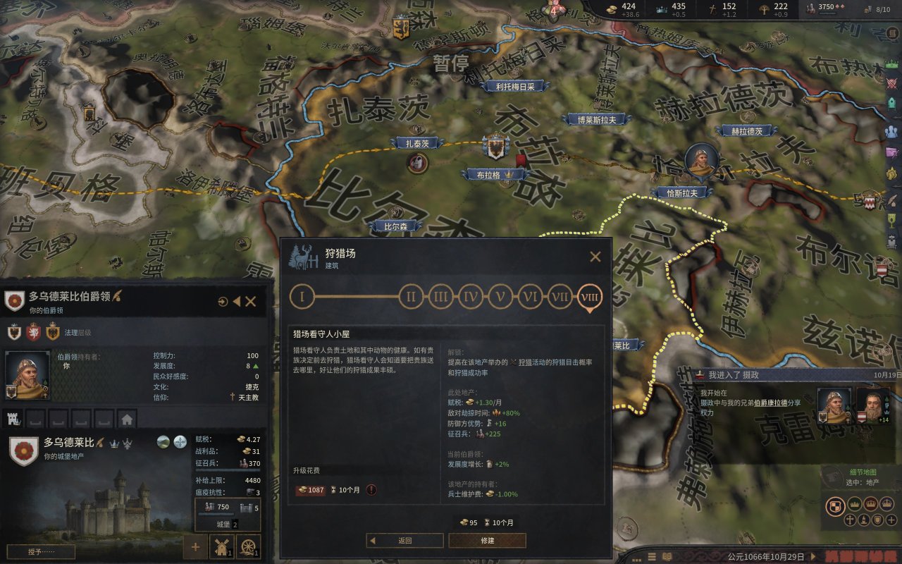 而在這個時候,我們的波西米亞公爵領的營建正在熱火朝天,幾乎每三個小時就能升級一個建築。而且可以利用改變伯爵領首府,來給其他的男爵領去建造水車和風車(這裏的bug是可以在建造好二級風車和水車後,再次轉爲男爵領,而這些建築仍然有效,而且可以卡出新的建築槽)。