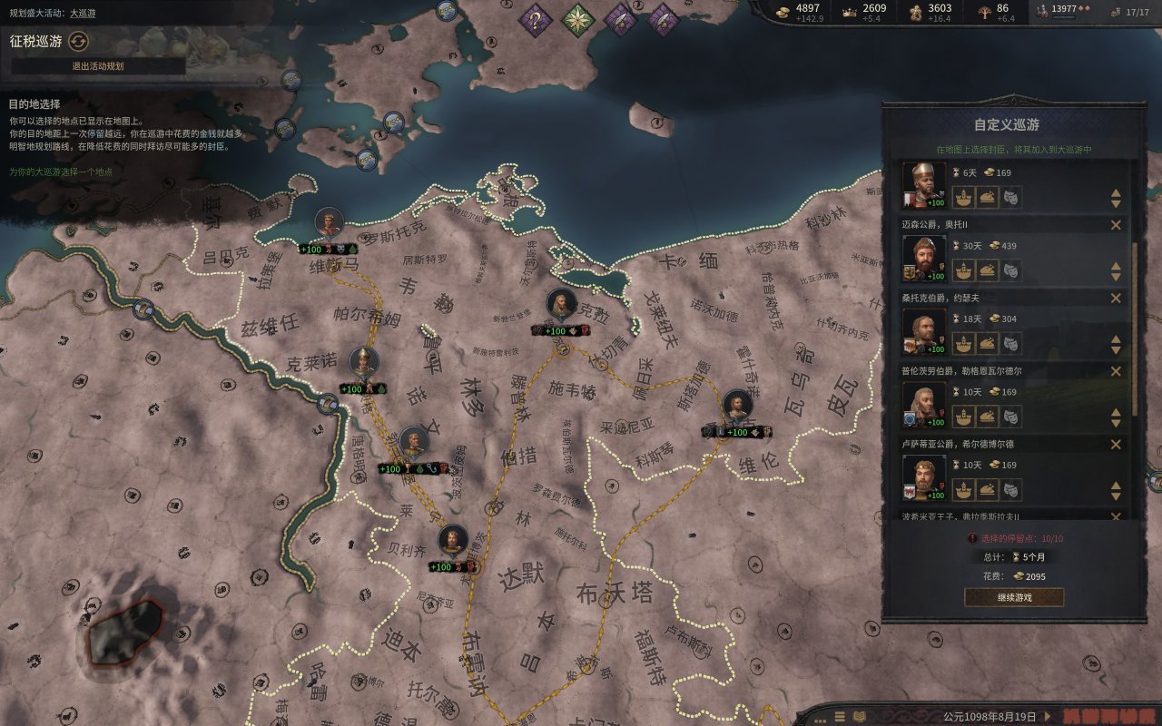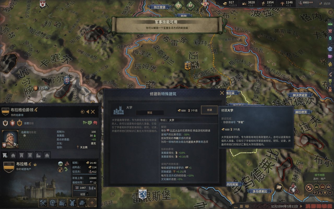 首先我們的公爵有着財政左線的全部技能點,而這些技能點非常有利於撈錢,右線對我們意義不大,但是中線至關重要,2個直轄和建築速度加成是非常有利於我們大規模發展經濟的。