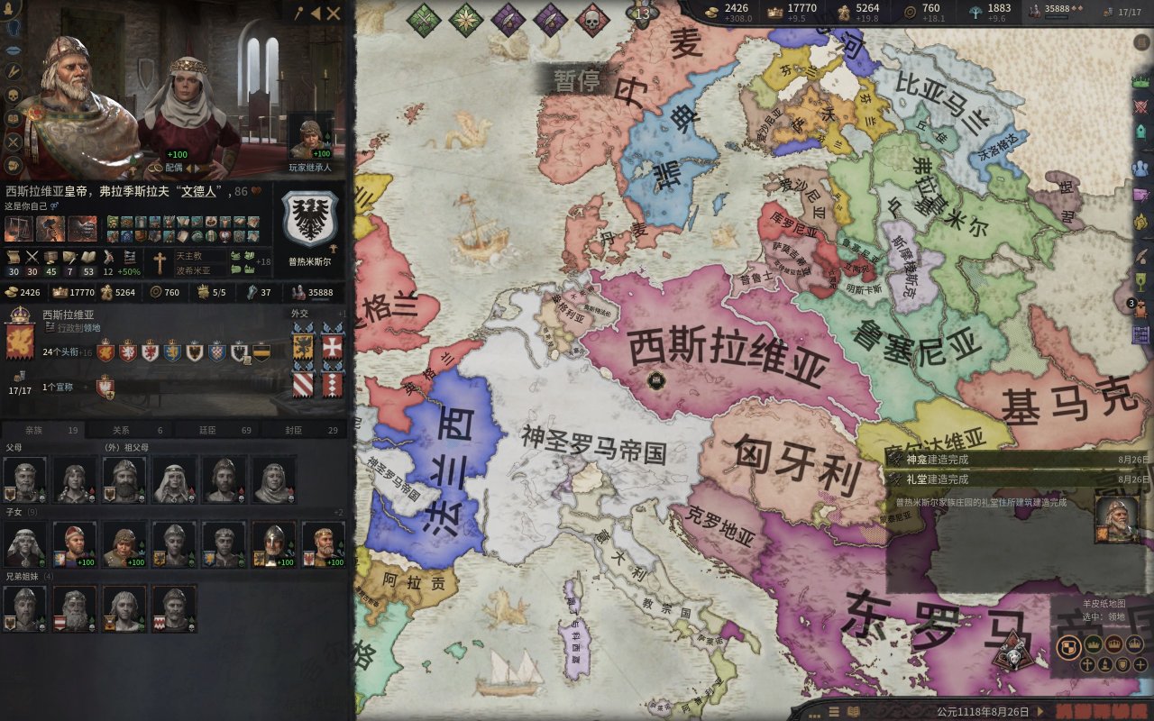作爲神羅中實力最強的封臣,且擁有足夠的兒子和兄弟,你的家族很容易發展壯大,而恰斯拉夫的銀礦和富裕的波西米亞也足夠讓你向着斯拉夫之地擴張。並且你的繼承法是當時相當有優勢的年長者繼承法,這能保證繼承者不會丟失領土,當然這個繼承法也是有弊端的。當然無論如何,憑藉着這一塊寶地,擊敗神羅皇帝,自己成立另一個帝國也未嘗不可!