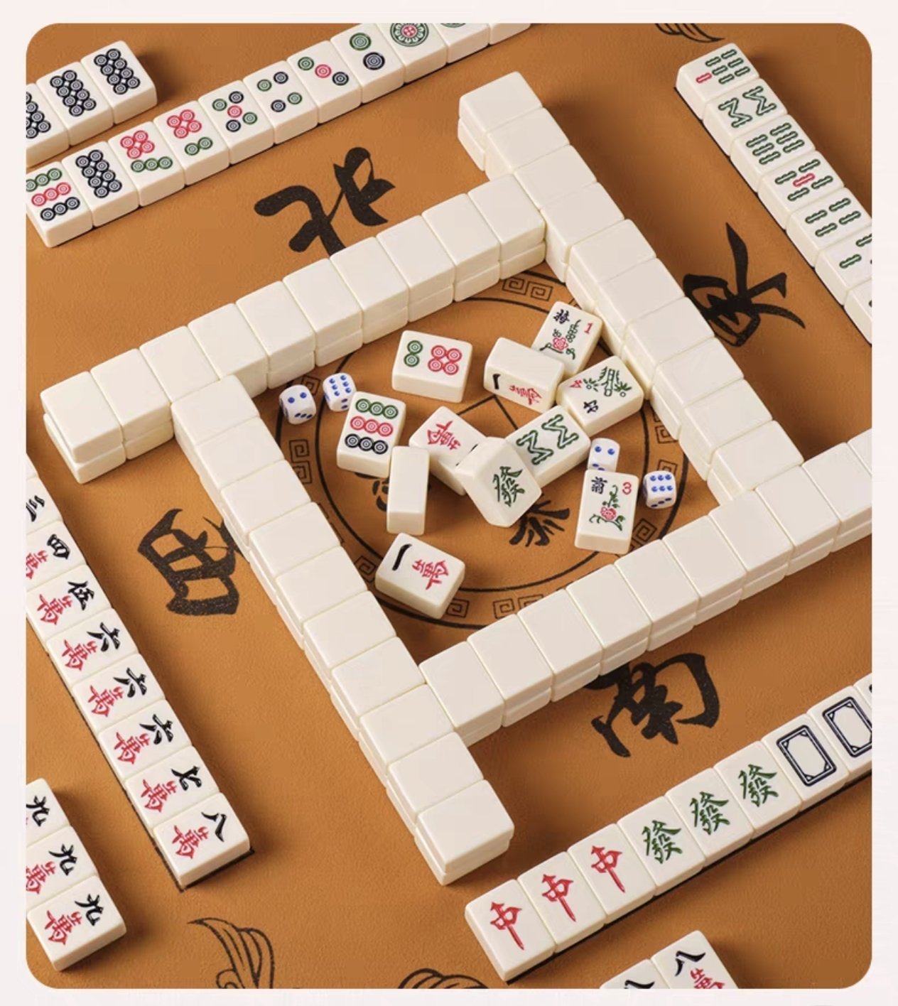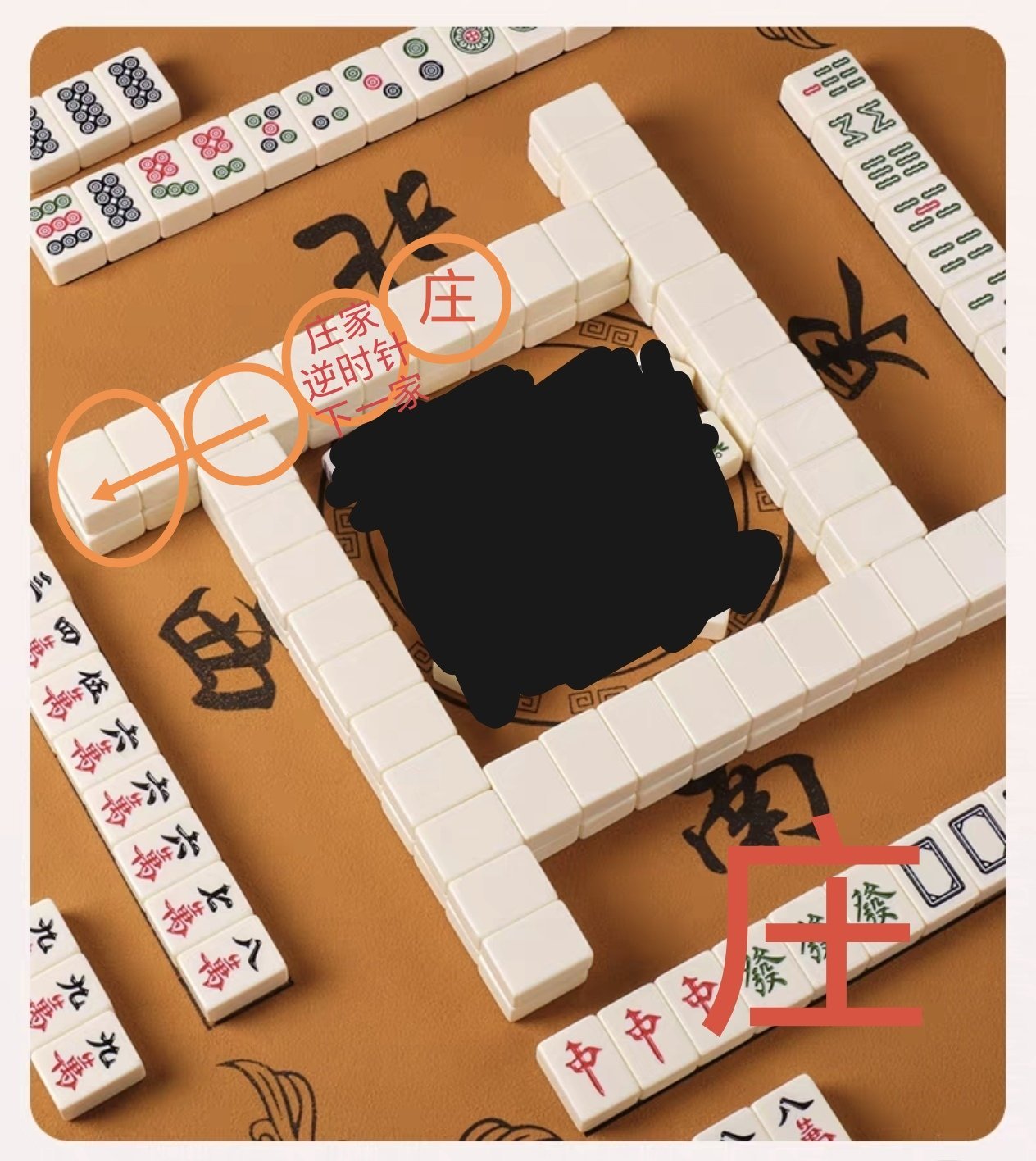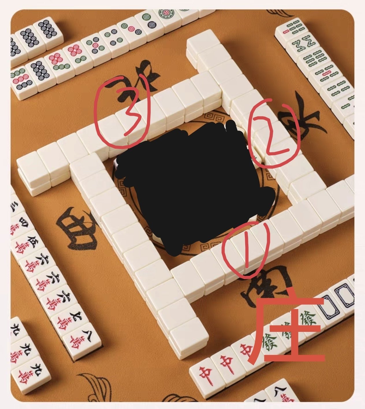 首先决定一个庄,庄家掷骰子,以下图为例子,掷骰子两枚,看哪个点数大。比如说大点为3,小点为2,那就以庄家自己面前这一栋麻将为1,逆时针数,1.2.3,也就是庄家对面的那栋麻将为起点。