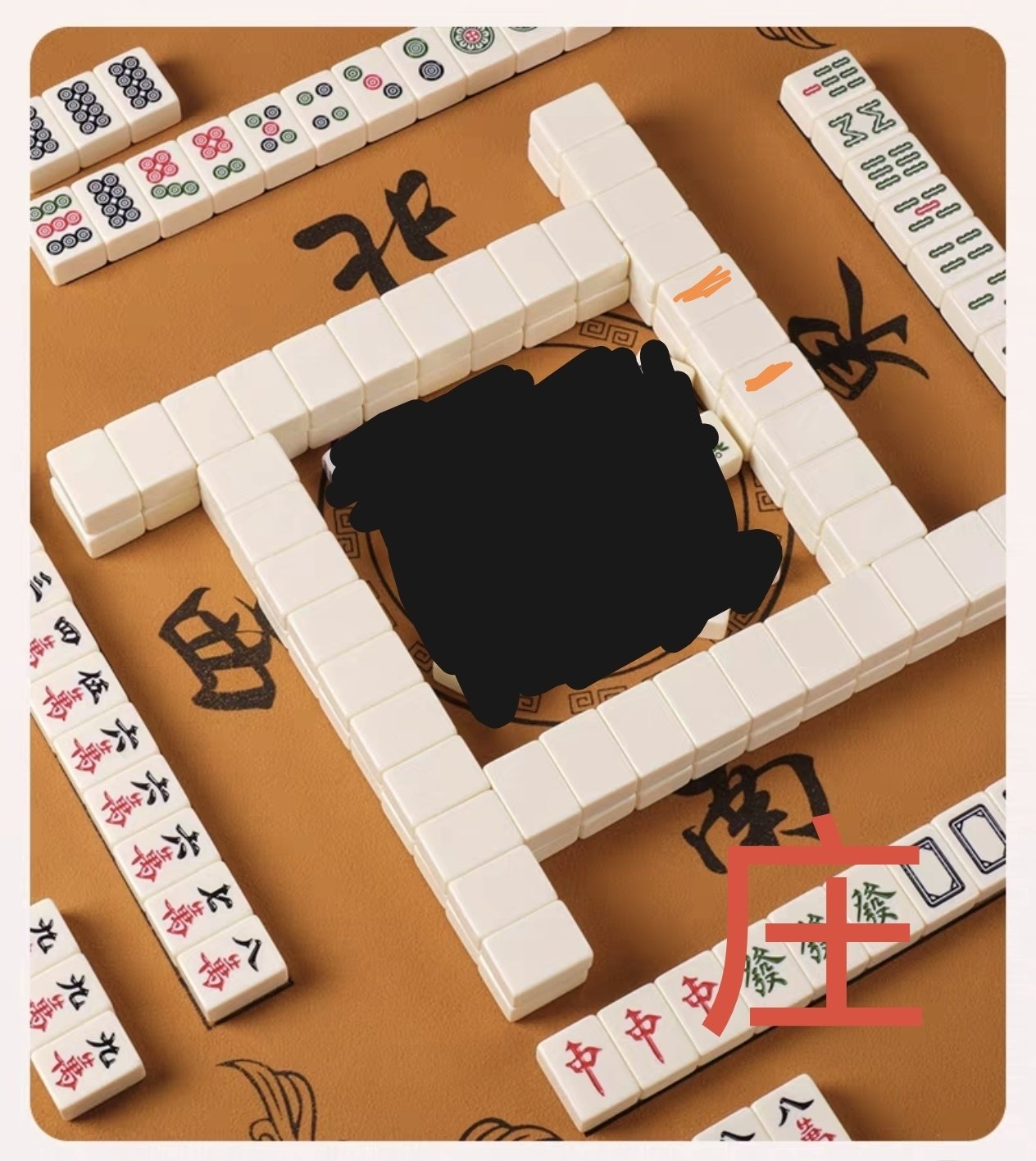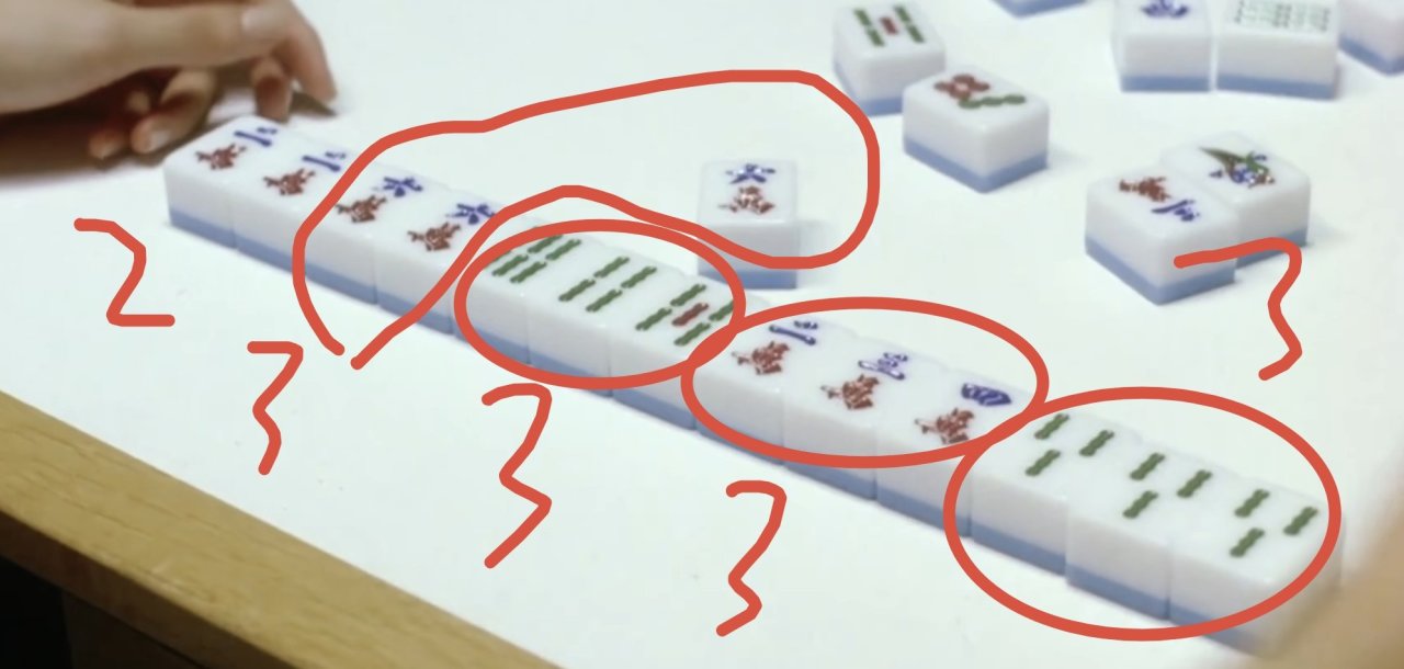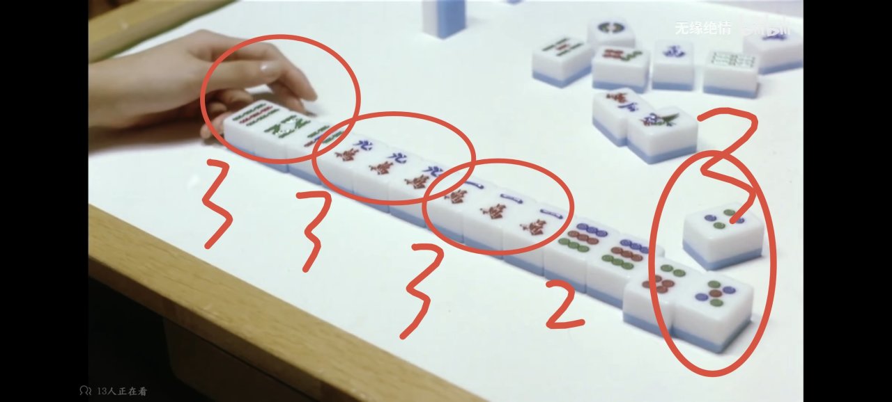 然后正常摸牌。逆时针摸,每个玩家都是摸一张打一张,通过对牌的更换来促使自己的牌凑成赢牌的条件,也就是我一开始说的3+3+3+3+2。