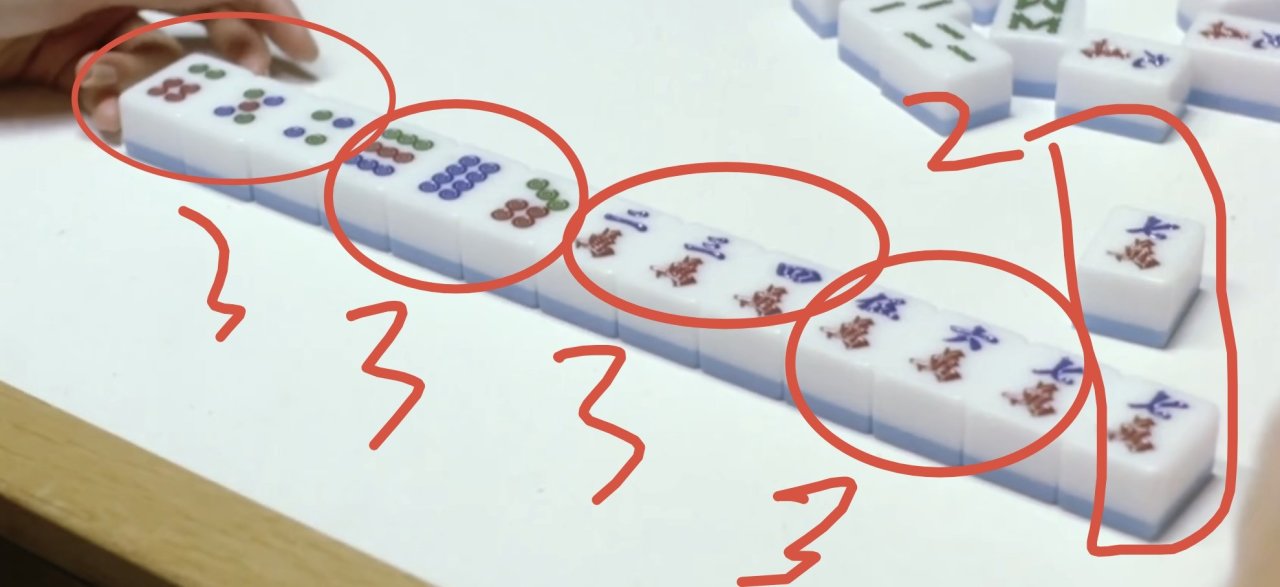 每个玩家的赢牌基本都是通过摸一张打一张来凑成3+3+3+3+2的样式。胜利例子如下