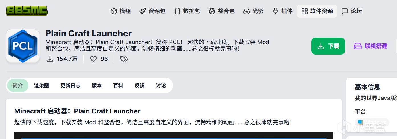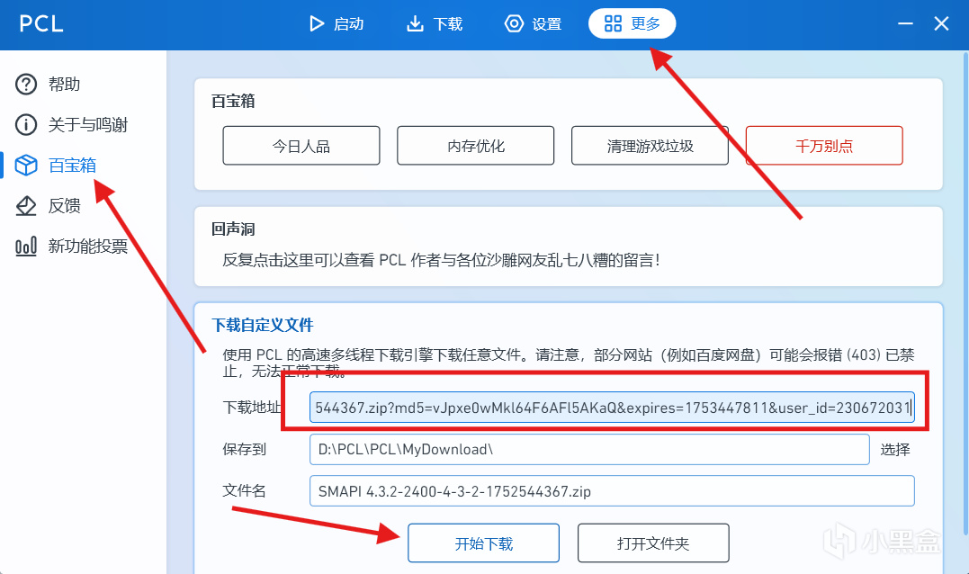 打开PCL,点击更多,选择百宝箱,将下载链接复制进去,点击下载