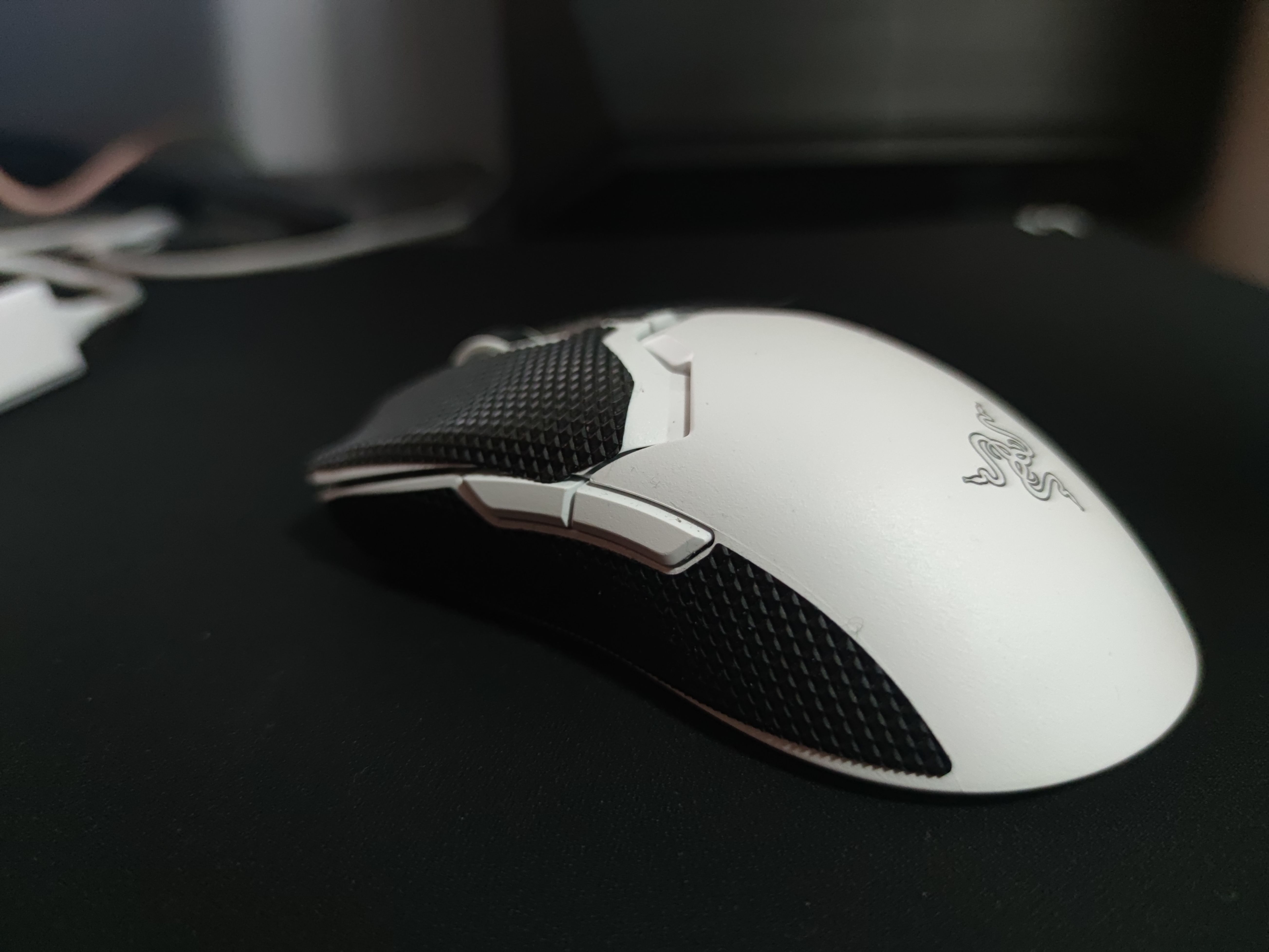 改成了塑料,毒蝰V2专业版的上壳,按键盖这次用的都是磨砂材质,和蝰蛇V3专业版一致,非常的干爽,大汗手也不太会打油。(但是汗渍过多很容易堆积到鼠标上)摩擦力足够,按道理来说是不需要防滑贴的。