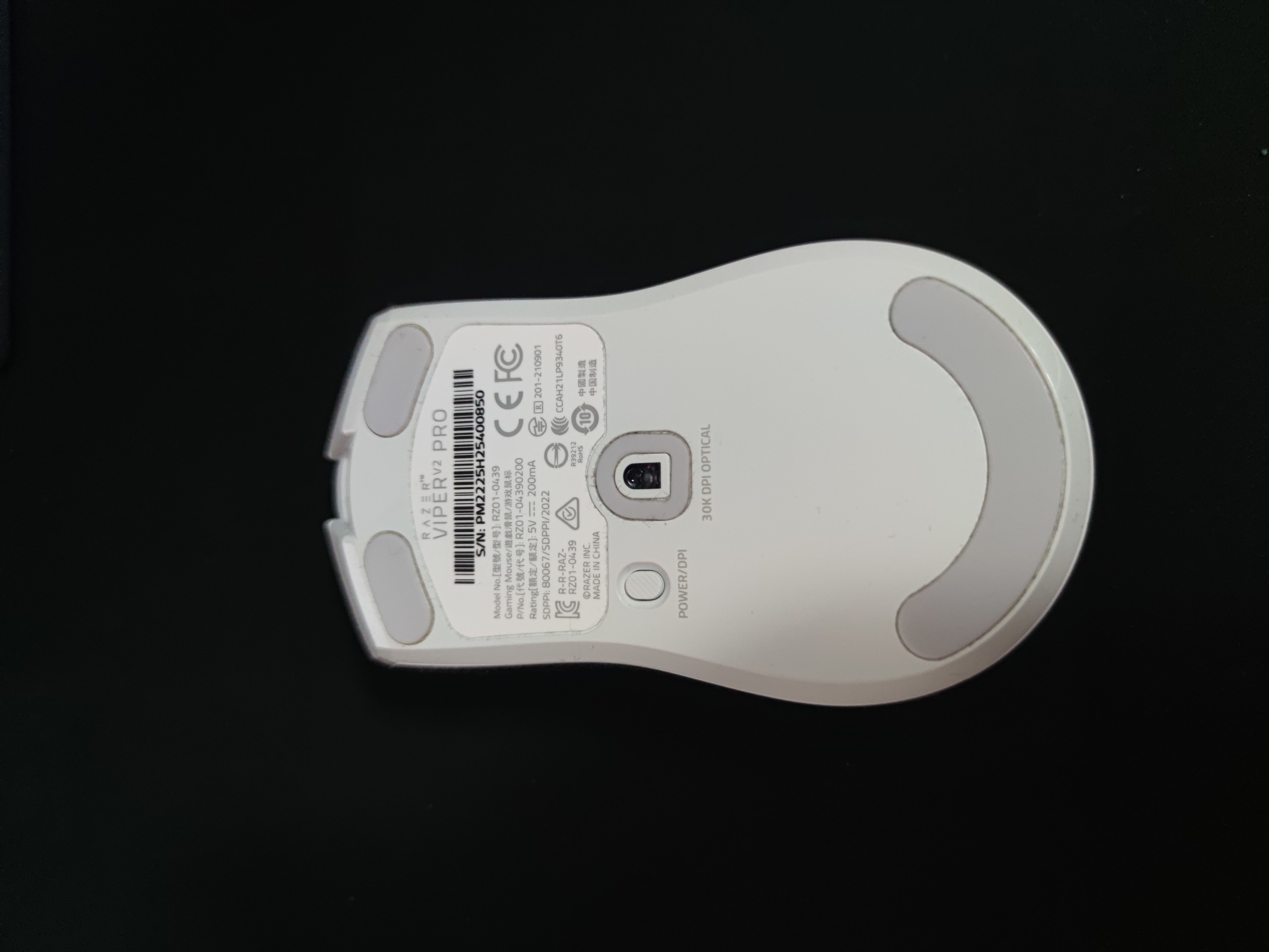 底部的部分,脚贴这次也是把之前对充电模块做出妥协的小块特氟龙脚贴改成了和炼狱蝰蛇V3专业版一模一样的笑脸特氟龙脚贴,然后把开关键和DPI切换键做了二合一处理。