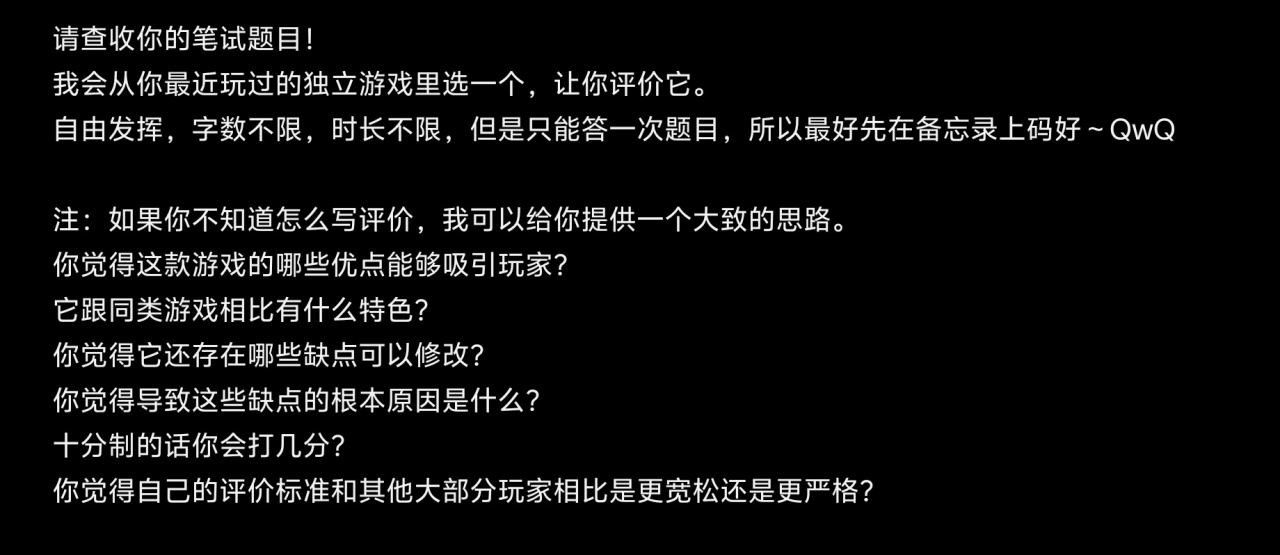 本来想问大家:“你认为一款好的独立游戏应该是什么样子的?”,但意识到这个问题太百花齐放,而且我绝不应该去对别人的该观点进行对与错的判断,最后改成了根据他们的库存里最近两周的选一个游戏让写游戏评价。