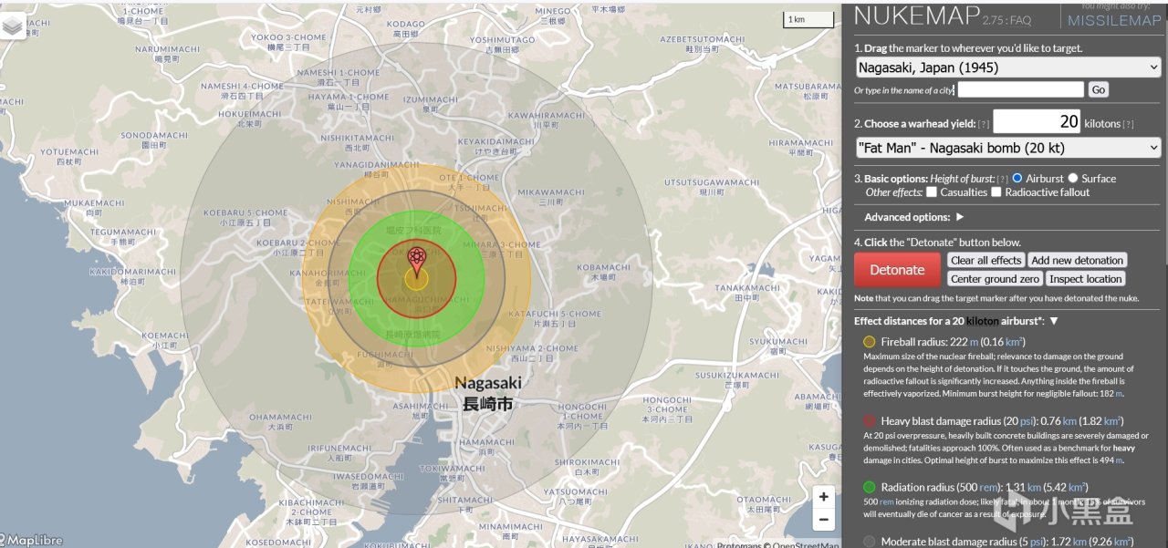 选择历史上出现过的某个核弹,选择城市,然后查看爆炸影响的范围大小
