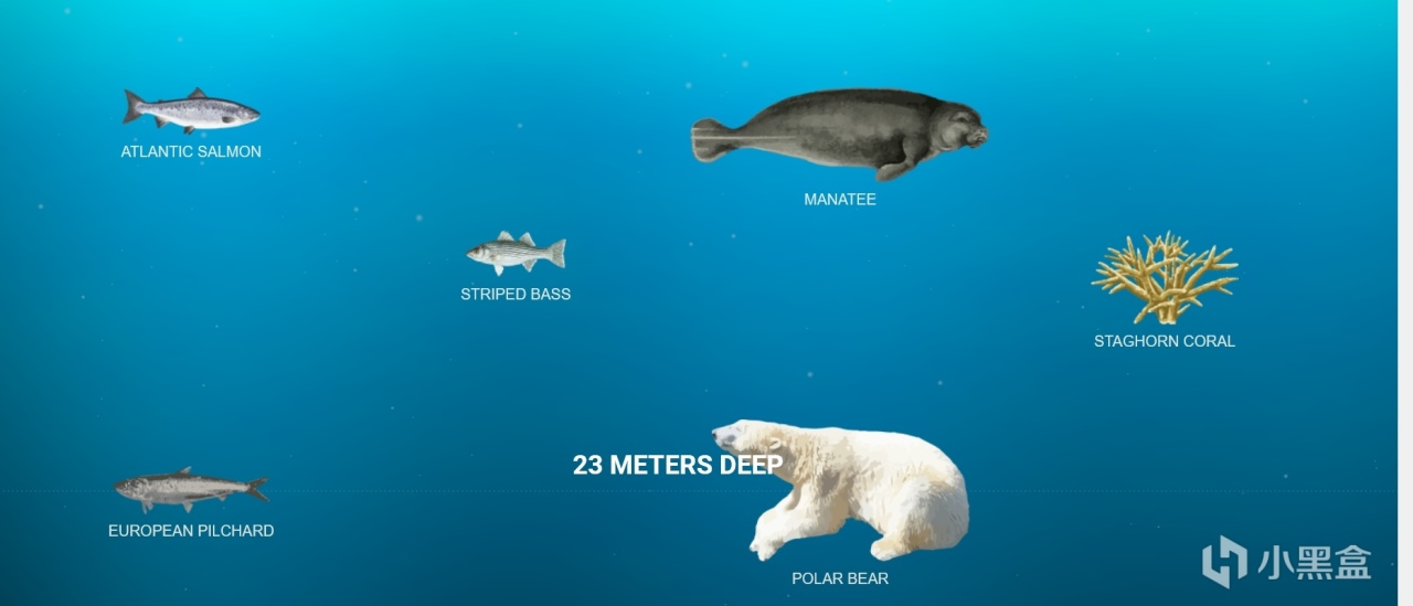 整体是一个类似于PPT的一个网站,展示了海洋不同深度都有什么生物,鼠标滚轮拖动可以拉到海底