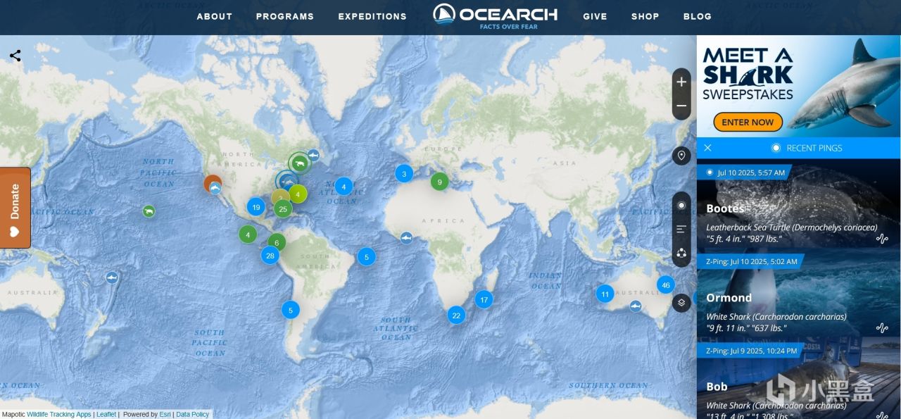 可以看到被植入追踪器的海洋动物们的移动轨迹