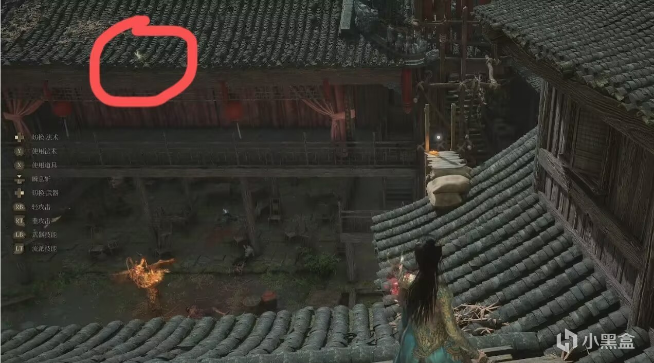 在二个院子的屋顶,下面就是一个会喷火耍杂技的怪