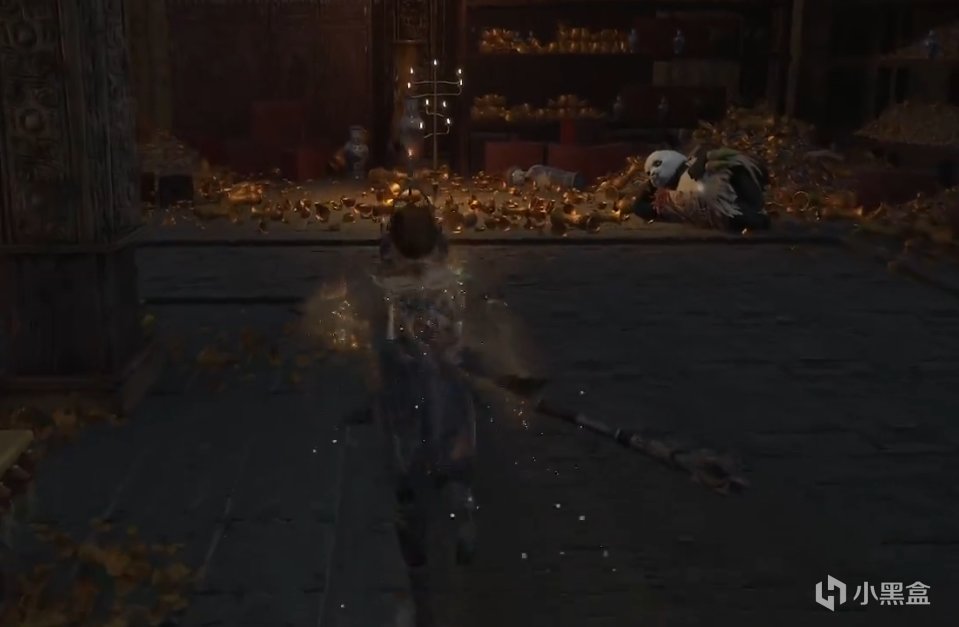 右边上楼梯,右转,顺着楼梯来到屋子里,左转,然后右转进入大门。进入大圆柱体,下降到下面.找到熊猫人,向左转,小宝箱里面。