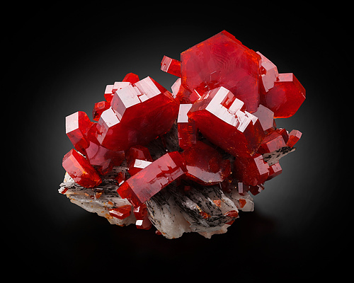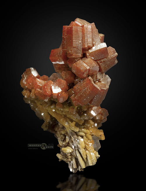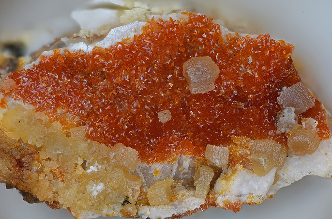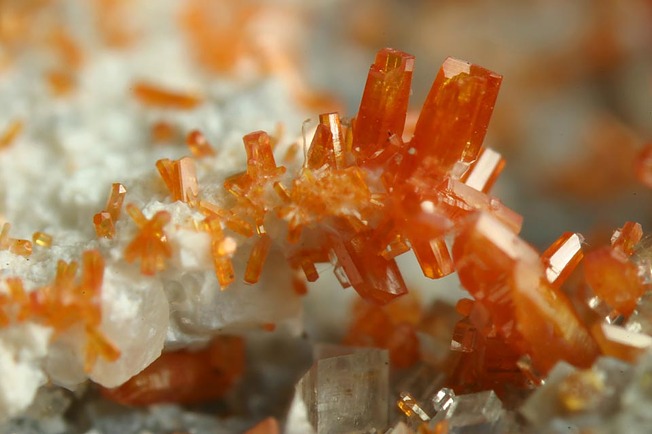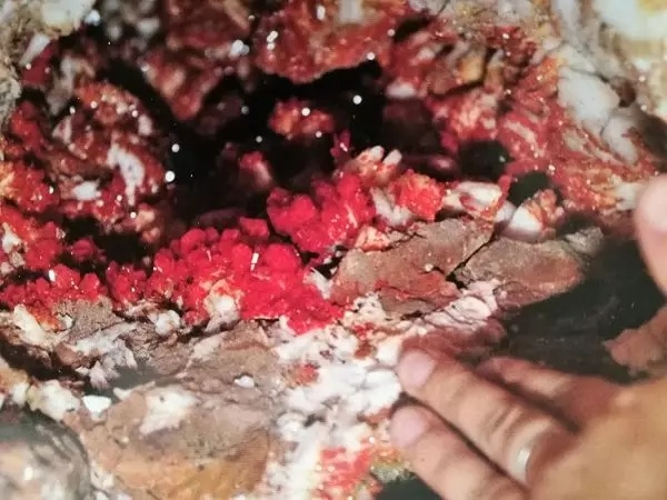 这里产出的钒铅矿以浓郁的红色色调以及不同于摩洛哥的六方柱状结晶闻名,时而共生一些雪白的白云石作为衬托,让本就鲜艳的钒铅更为光彩夺目。