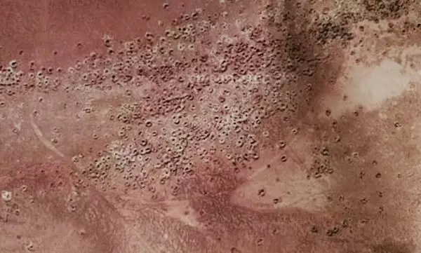 Coud'a矿区卫星图,Mibladen区域,大约600m宽,可以看到大大小小很多矿坑