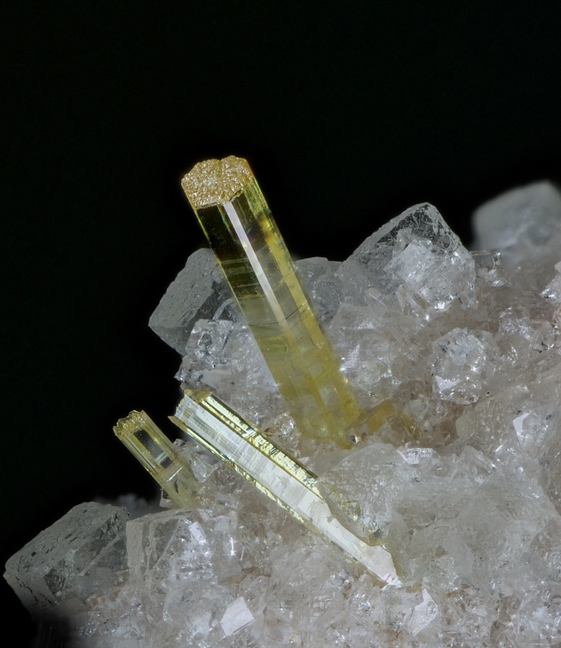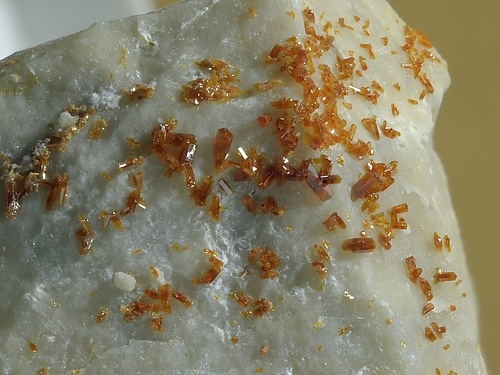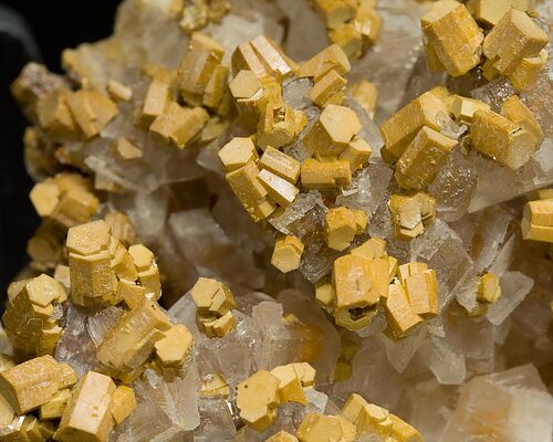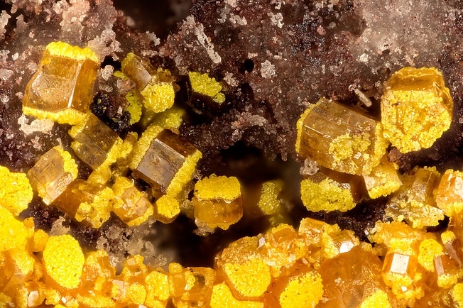 黄色的钒铅矿长在白色的方解石基底上,没有光泽的它们看起来就像积木。