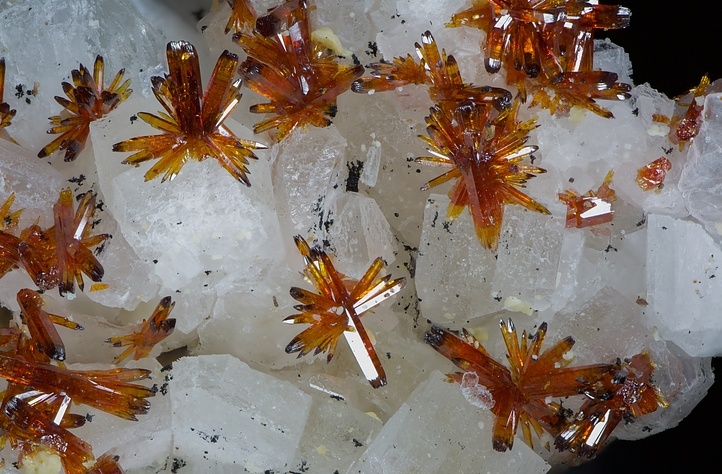 钒铅矿与方解石共生,产地美国。Black Prince Mine, Picketpost Mountain area, Superior, Pinal County, Arizona, USA 图源:Michael C. Michayluk