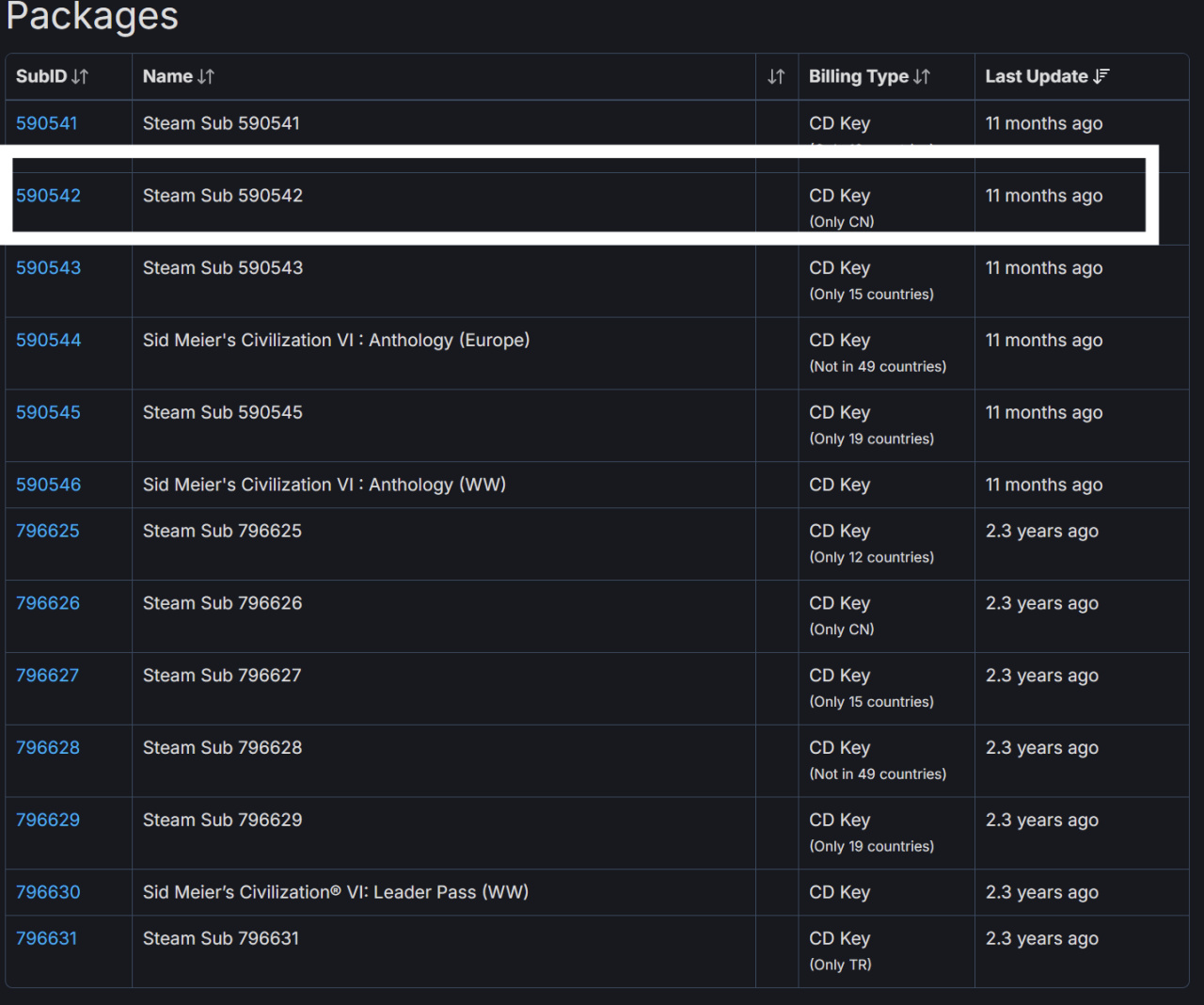 在 Steam 上,一個遊戲有唯一的 APP ID 和若干 sub ID(子 ID)來區分不同地區的銷售策略。