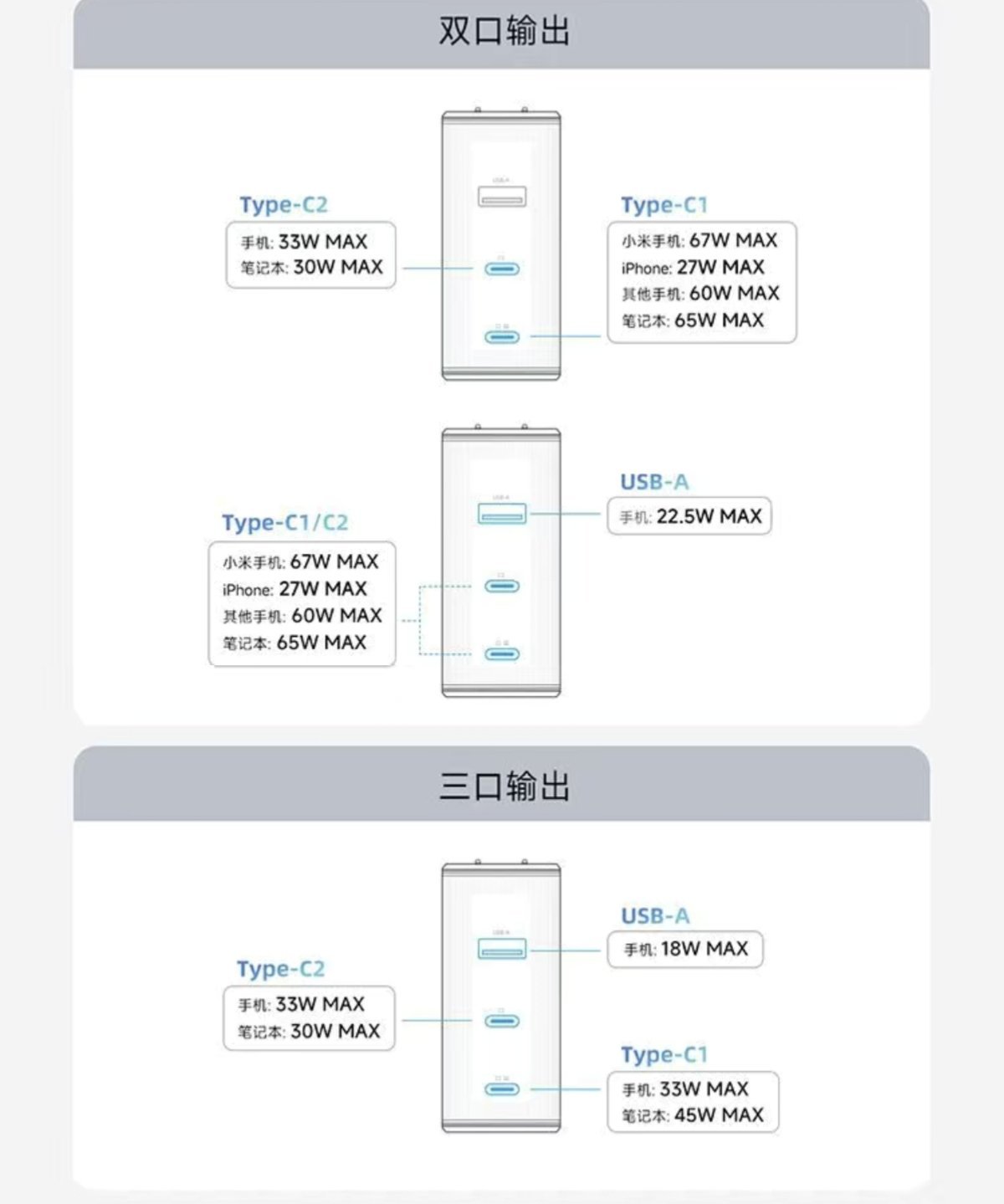 多口輸出的情況下,同時使用c1c2會使上邊的c1最高功率爲67w,c2爲33w。只能說多口輸出不夠激進。