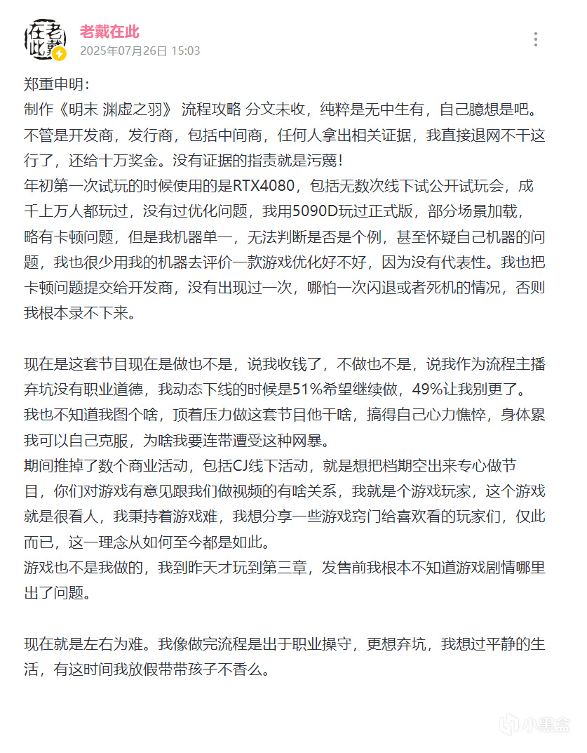 甚至还有人开始网暴做这款游戏评测或者攻略的UP主。玩游戏不过是他们的工作而已,这些游戏里里外外的问题和他们有什么关系?他们何错之有?还有质疑他们是不是收钱了,对游戏在公开试玩阶段的问题闭口不谈。当然我相信一定有看到这篇文章的人说我收钱了。看到这些言论的我只感觉有些人既缺乏以人为本的历史观,也缺乏基本的逻辑思维和事实核查能力。