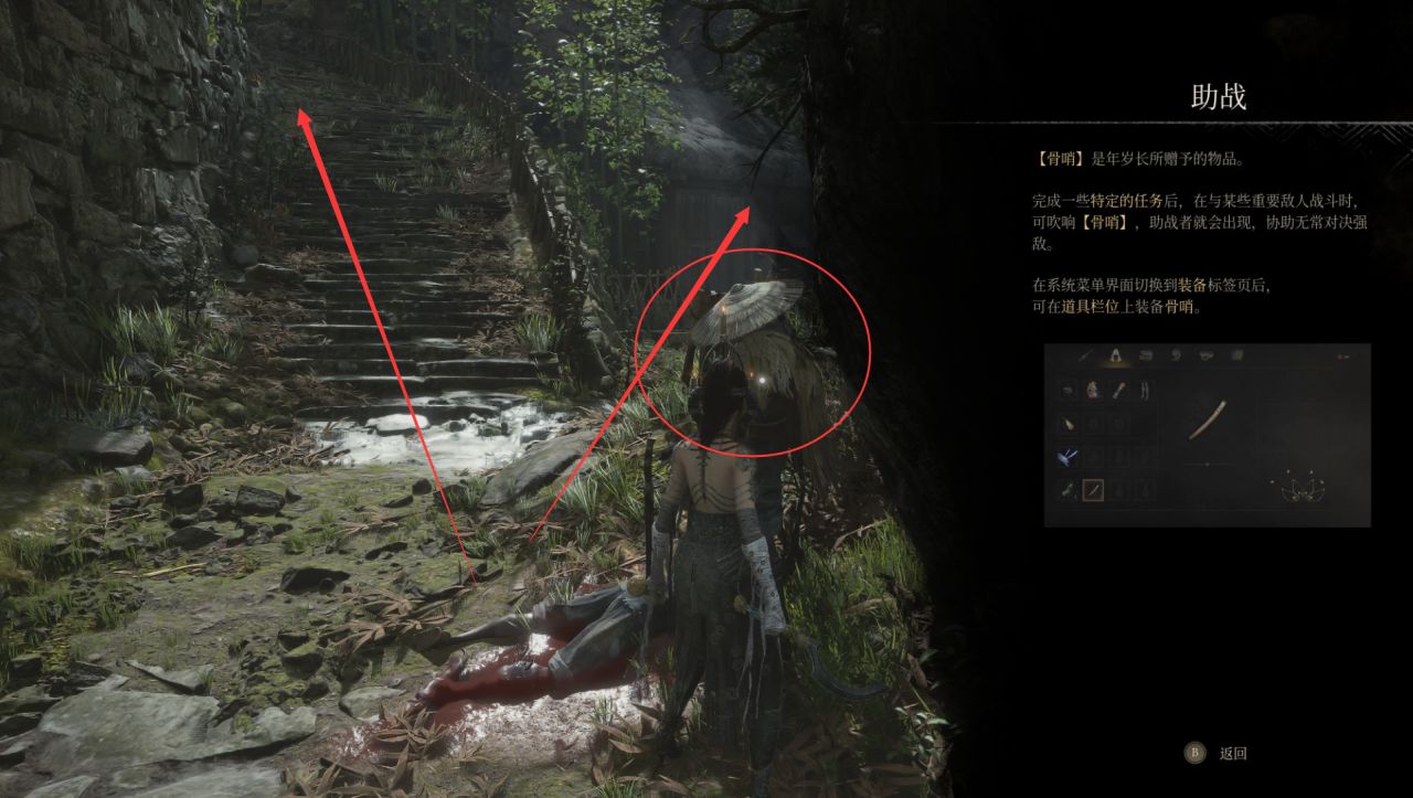 在蜀王祠打BOSS【“羽化祭司”祿秉璋】時,使用他給你的骨哨可以召喚年大俠幫你打。