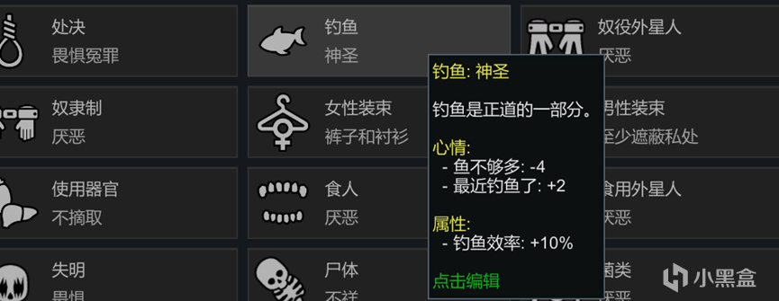 會根據神聖,反感和禁忌提供若干心情增減益,對他人印象不同幅度的減益以及釣魚效率與速度(是的釣魚效率和釣魚速度是兩碼事)的增減益