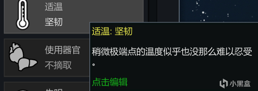 適溫堅韌:移除了小人在非舒適溫度時的心情減益,但低溫症和中暑之類的負面buff還是會有