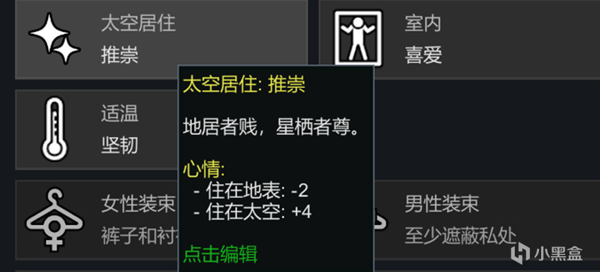 太空居住:會在太空中提供四點的心情加成和在地時提供兩點的心情減益
