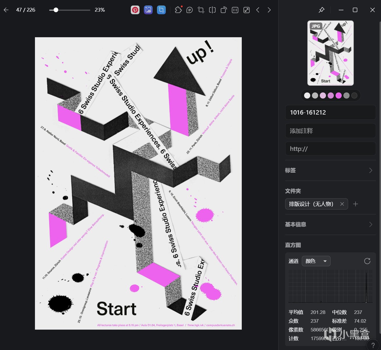 图片浏览会在右边显示图片的主要色调,如果是摄影照片也有直方图观察。