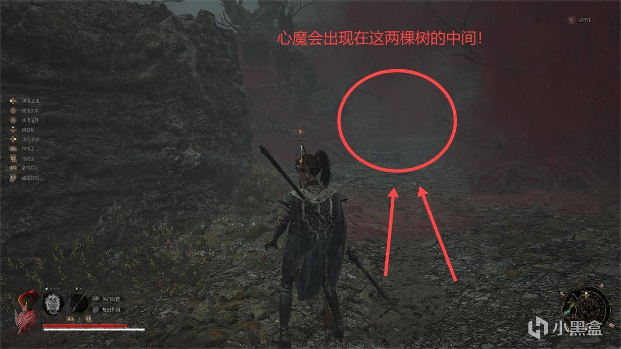 下去以后直走心魔会在这两棵树之间出现!