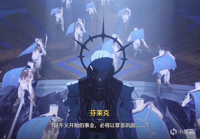 从笔记中和芬莱克与手下的对话中我们可以看到他自己经常会遗忘然后记忆断片,甚至所做事情前后相悖的情况,已经隐约能猜到芬莱克身上发生了什么,笔记中还能看到芬莱克魔怔一样的想要先带给人们恐惧才能让民众信服神明这种明显不该是信奉神明的宗教做出来的事情,他却在笔记中说的天经地义,最终芬莱克右脸的面具被击飞,黑潮爬满了他苍老的面容,想要拯救所有人的主教,变成了带来毁灭的鸣式代行人。