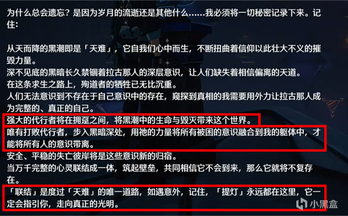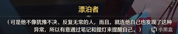 而隐海修会又为何与残星会合作?从芬莱克遗留在试验场的笔记中我们发现,芬莱克已经意识到鸣式的力量来源,并给出了修会的解决方案:打败代行者,步入黑潮以自身为载体融合所有被困在黑潮中的意识让其脱离,这段话的信息量很大,首先说明了鸣式在黎那汐塔的力量来源是困在黑潮中的频率意识或是灵魂,不将黑潮中的意识带离,利维亚坦将无限复苏。其次说明了和残星会结盟而非黑海岸的原因即被代理的意识需要载体,弗洛洛的失亡彼岸将是意识的新归宿,所以帮助弗洛洛完成失亡彼岸是各取所需,但这也意味着他们的结盟从一开始便不会有好的结局,残星会和隐海修会的最终目的都是独自享用失亡彼岸。