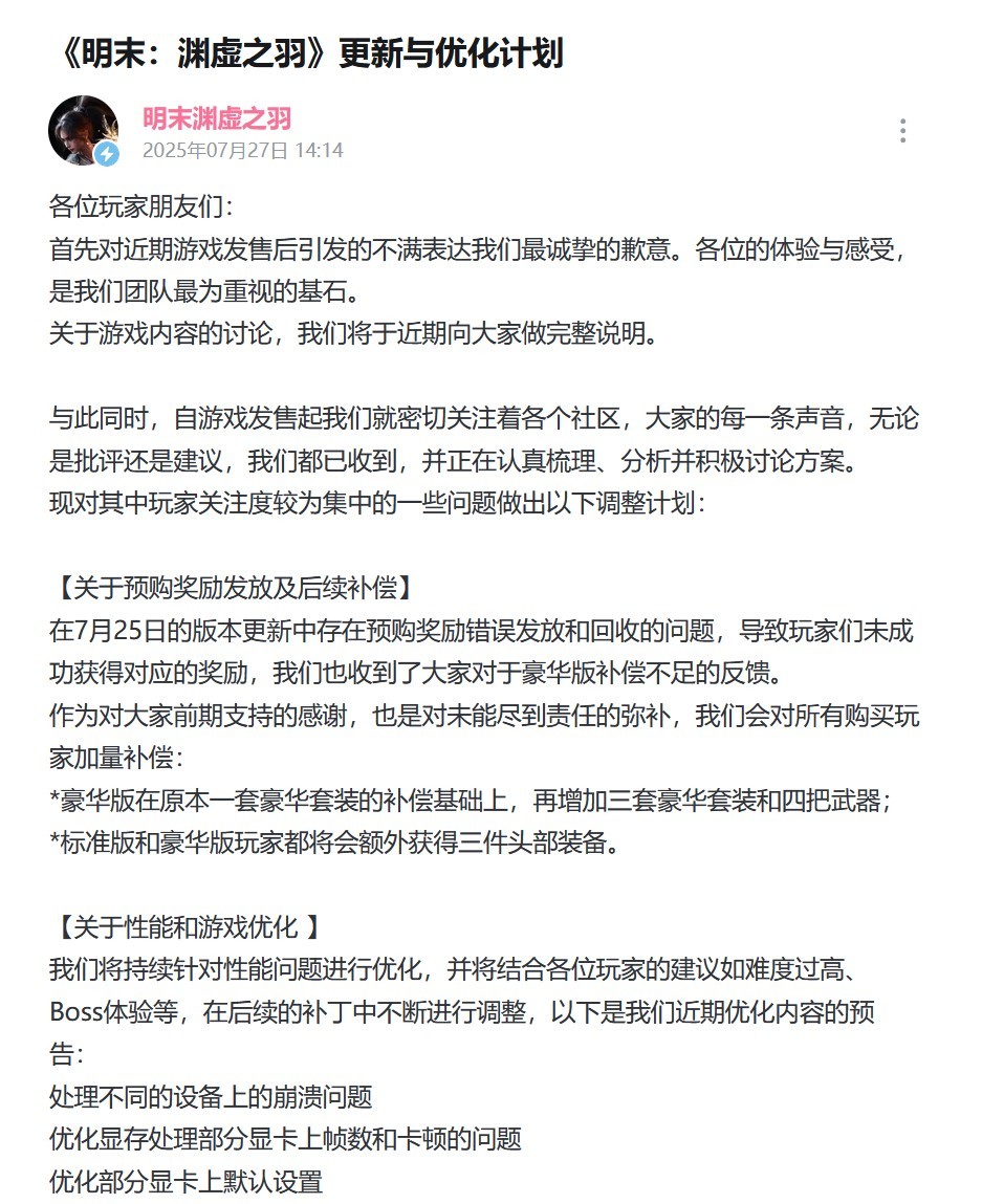 昨日,《明末:渊虚之羽》官方发布新公告。