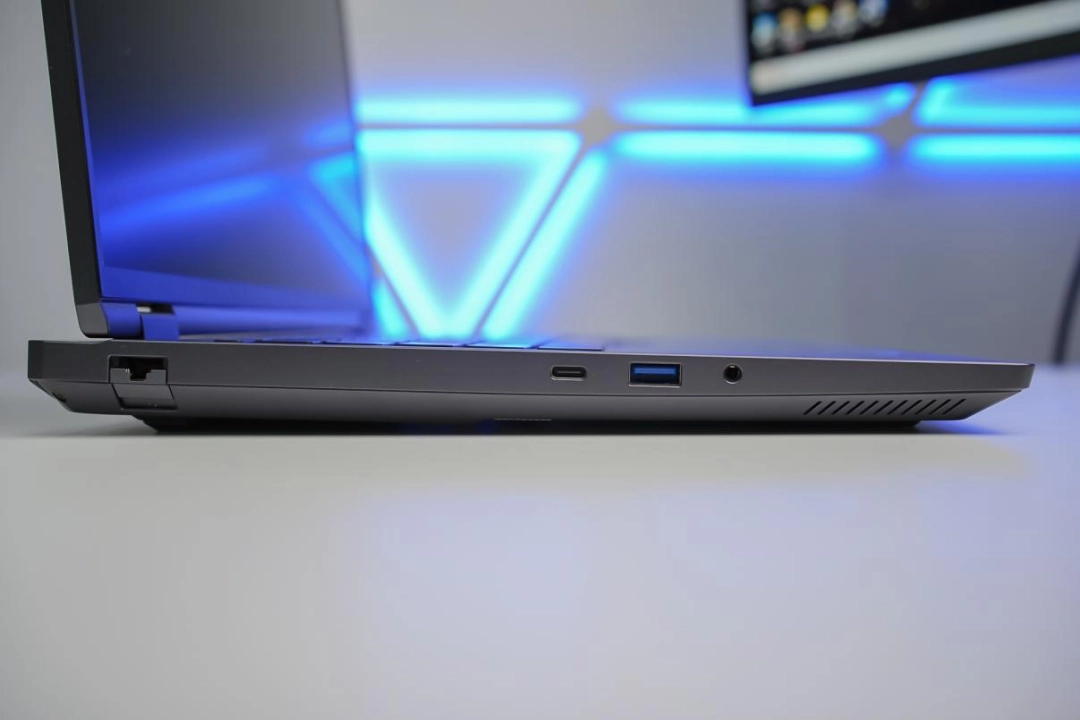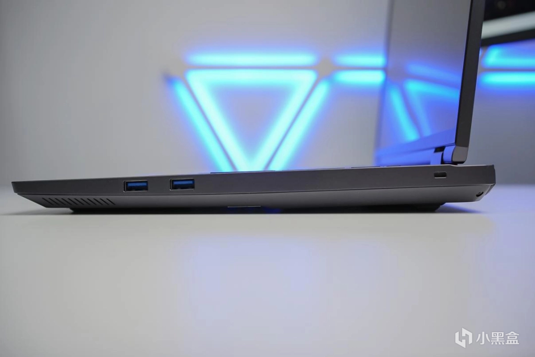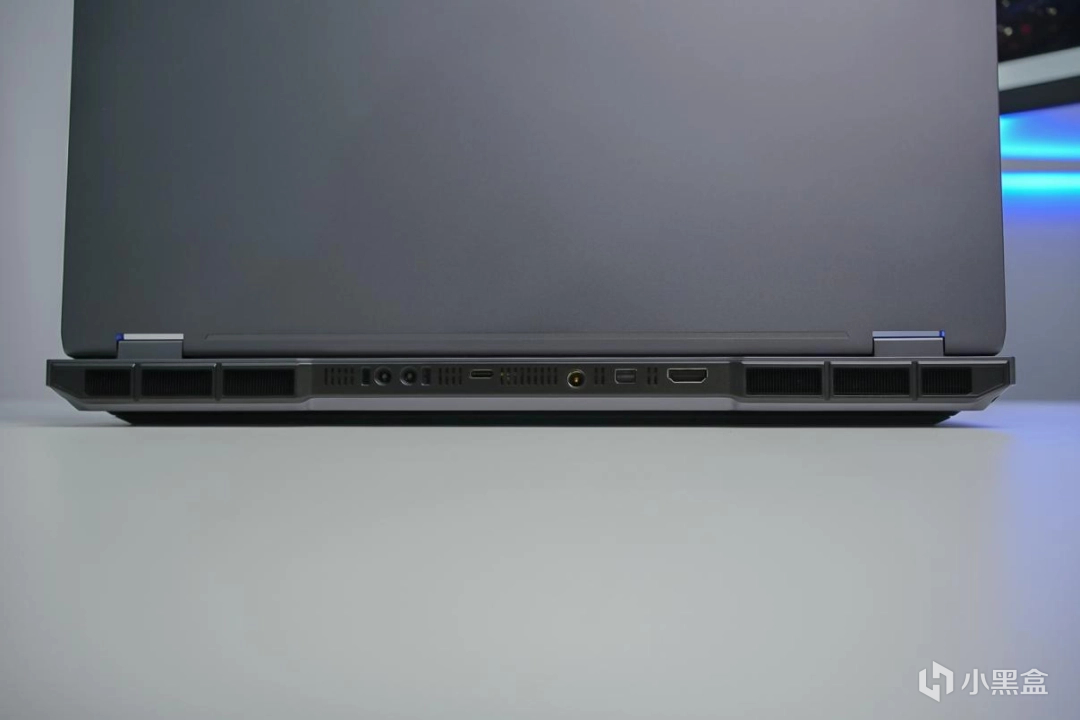 接口方面,左側一個RJ45網口,一個Type-C接口(10Gbps,PD 100W,DP1.4),一個USB-A接口(5Gbps),一個3.5mm耳機耳麥接口。右側是兩個USB-A接口(5Gbps)以及一個防盜鎖孔。