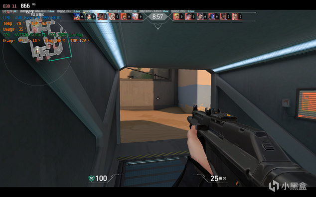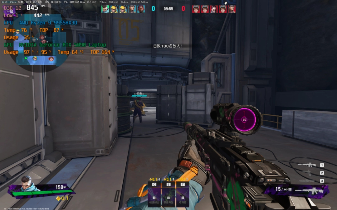在5v5死鬥中,略有降低但也能保持800+fps的水準,1%low幀也超過了600fps,遠遠超過了屏幕的300Hz上限。