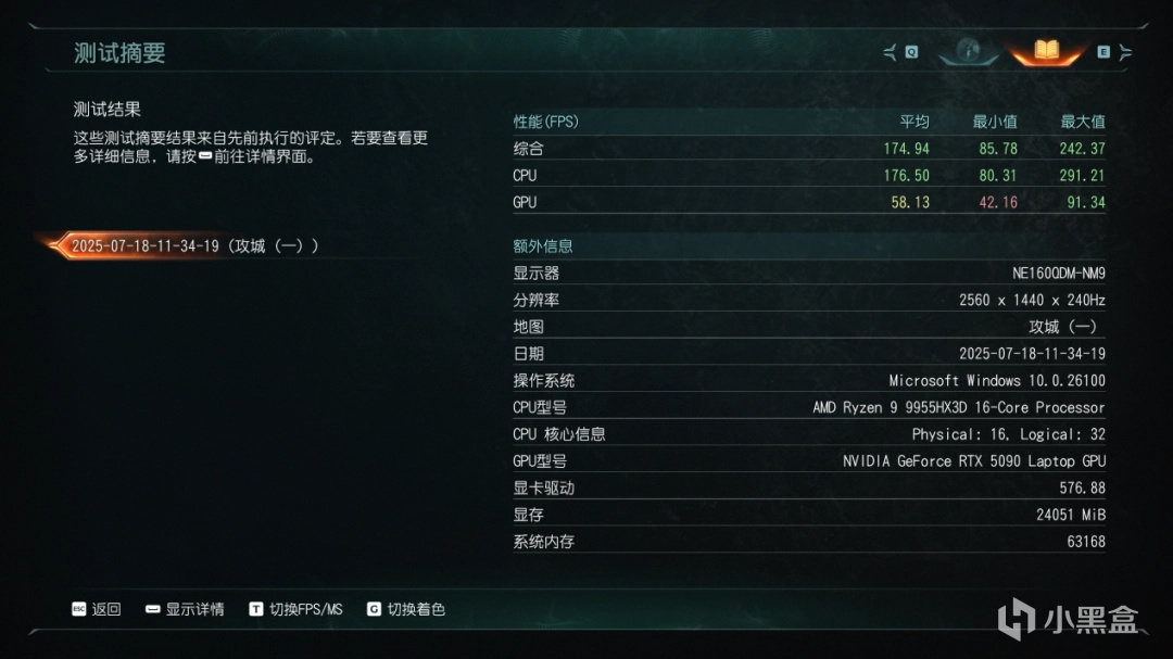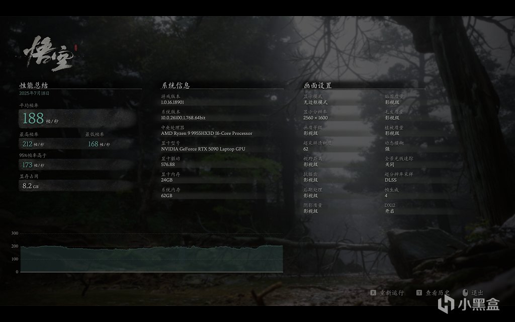 接下來再來看幾款3A遊戲,它們將在2.5k分辨率最高畫質下運行。首先是《黑神話悟空》,在影視級畫質下開啓DLSS 4X,平均幀數可以來到188fps。在開啓全局光線追蹤後,依然能保持不錯的成績,平均幀數爲144fps。